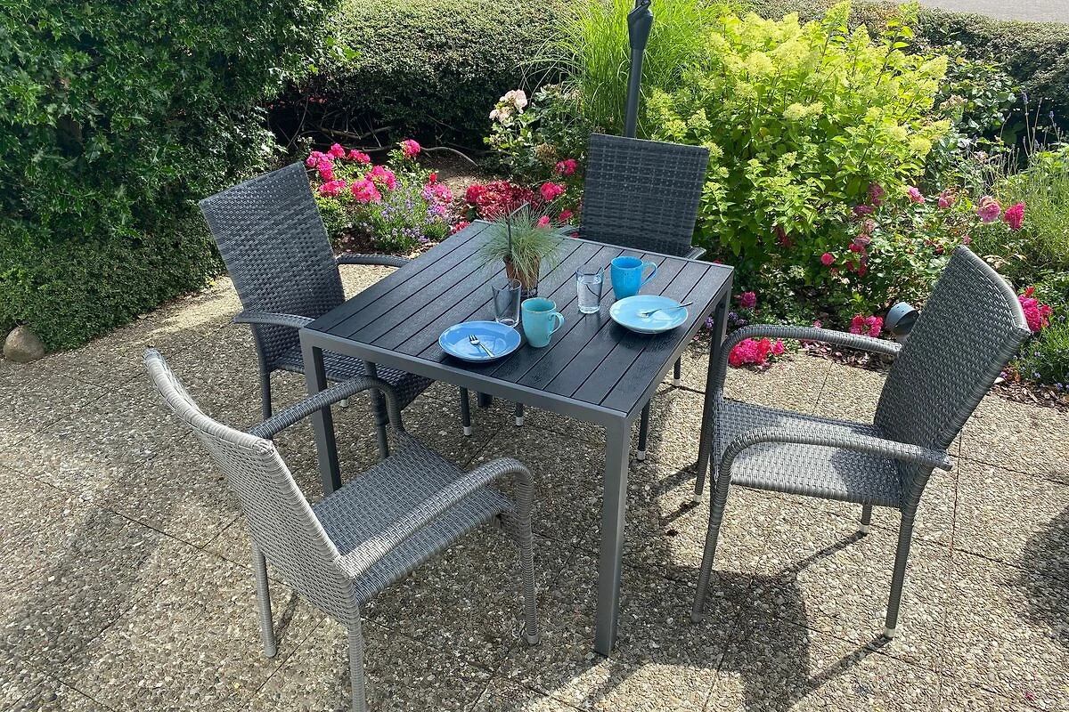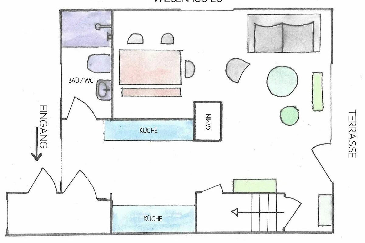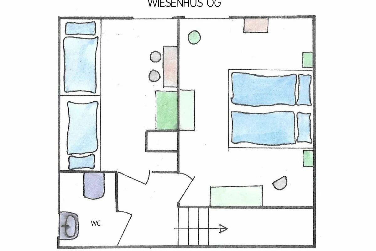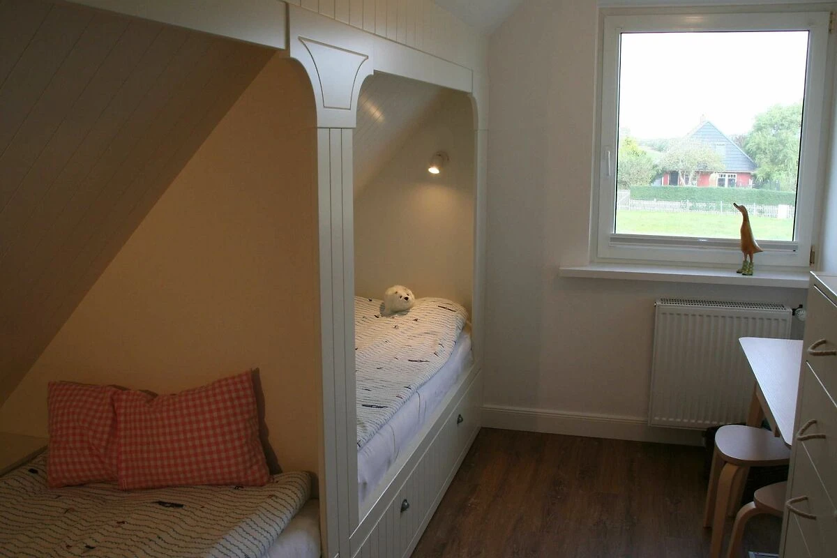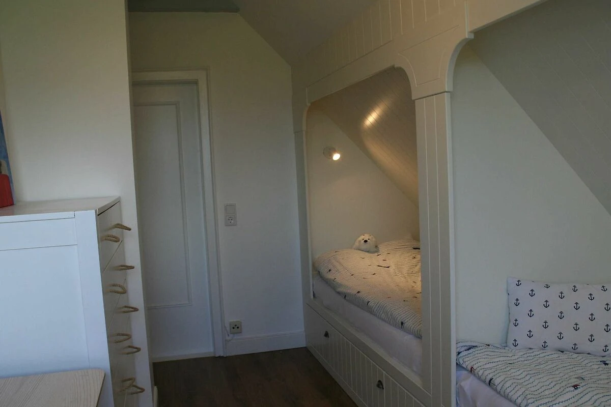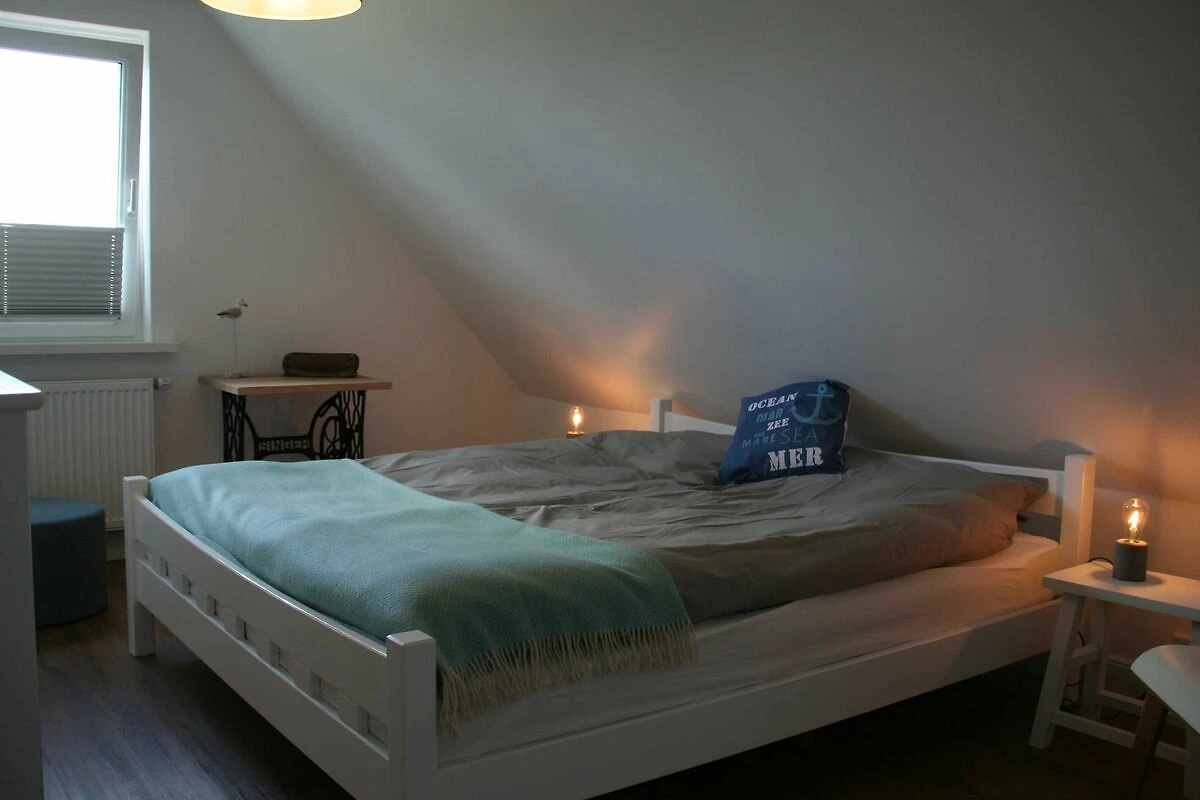 Das ruhig gelegene und von Feldern umgebene Wiesenhüs ist eine DHH, die im Jahr 2020 vollständig renoviert wurde. Das Haus erstreckt sich über zwei Etagen und bietet ausreichend Platz für bis zu vier Personen zuzüglich einer Kinderaufbettung. Im Erdgeschoss befindet sich die offene Küche. Von ihr aus gelangt man einerseits ins Duschbad, andererseits in den grosszügigen Wohnbereich mit Ess- und Sitzecke. Dort befindet sich ein Flat-TV, ein Blue-ray-Player und eine Multimediaanlage. An das Wohnzimmer schliesst eine Terrasse an, die bis zum späten Mittag Sonne bietet. Für den Genuss der Nachmittags- und Abendsonne steht auf der anderen Hausseite eine zweite Terrasse mit Strandkorb und Blick auf die Wrixumer Mühle zur Verfügung. Im Obergeschoss befinden sich ein weiteres WC, ein Schlafzimmer mit Doppelbett, Einbauschrank und TV sowie ein zweites Schlafzimmer mit Alkovenbetten im friesischen Stil. Hier lässt sich ein zusätzliches Bett als fünfte Schlafgelegenheit herausziehen. Ein privater PKW-Stellplatz befindet sich am Haus. Das gemütliche Wiesenhüs liegt ruhig und ist geschmackvoll, hochwertig-nordisch eingerichtet. Mit gut ausgestatteter Küche, Kaminofen, zwei Terrassen, Grillgelegenheit, eigenem Strandkorb und weitem Blick über die umliegenden Felder bietet es alles, was Sie zum Entspannen brauchen. Das Wiesenhüs liegt perfekt für alle, die einerseits die Ruhe und Idylle eines ursprünglichen friesischen Dorfes suchen, andererseits aber auf das pulsierende Strand- und Stadtleben der angrenzenden Stadt Wyk nicht verzichten möchten. Sowohl die Weiten des Marschlandes mit seinem riesigen Vogelschutzgebiet als auch die Fussgängerzone, zahlreiche Einkaufsmöglichkeiten und der Badestrand sind in wenigen Minuten erreichbar.