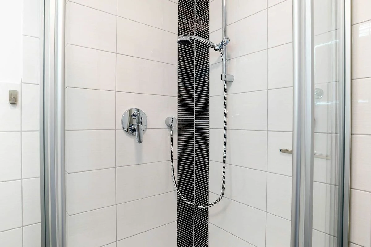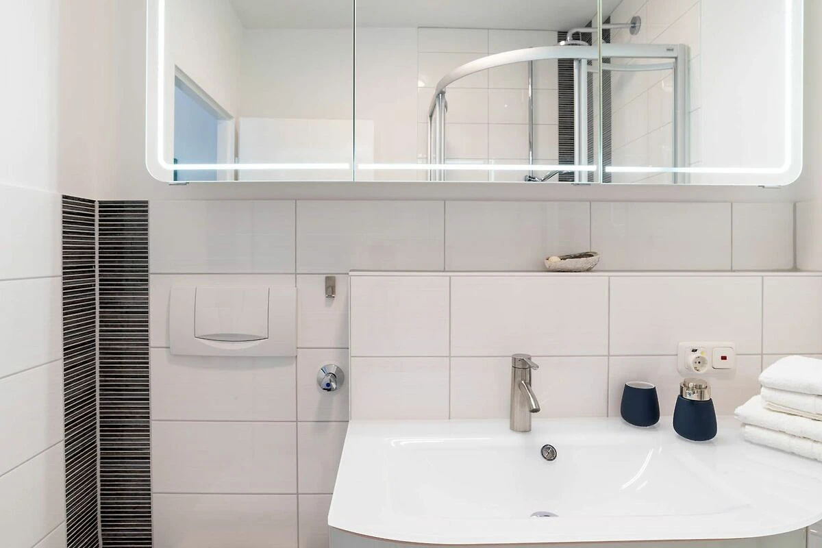 Über den Flur gelangen Sie neben einer kleinen Abstellkammer auch in das moderne Badezimmer. Ein grosser Spiegel sowie Waschbeckenunterschrank geben Ihnen auch hier die Möglichkeit Ihre Utensilien zu verstauen.