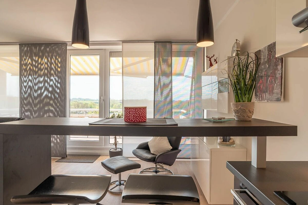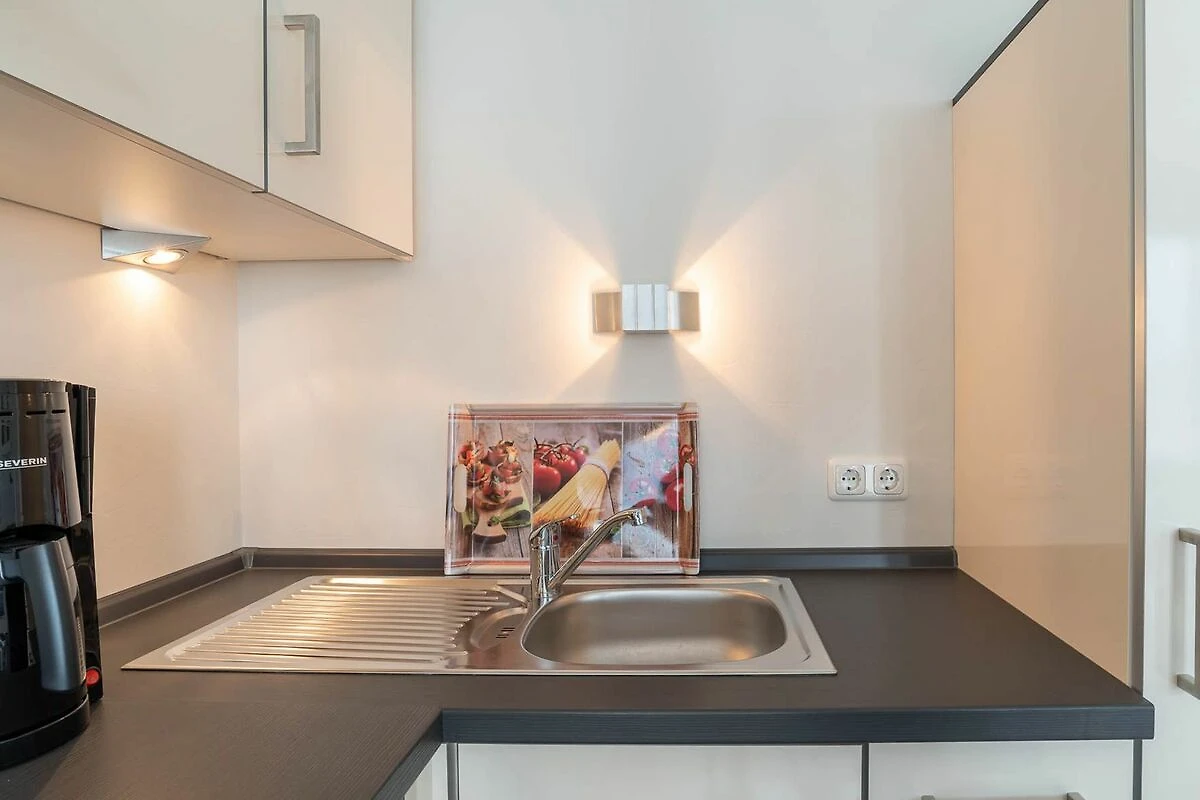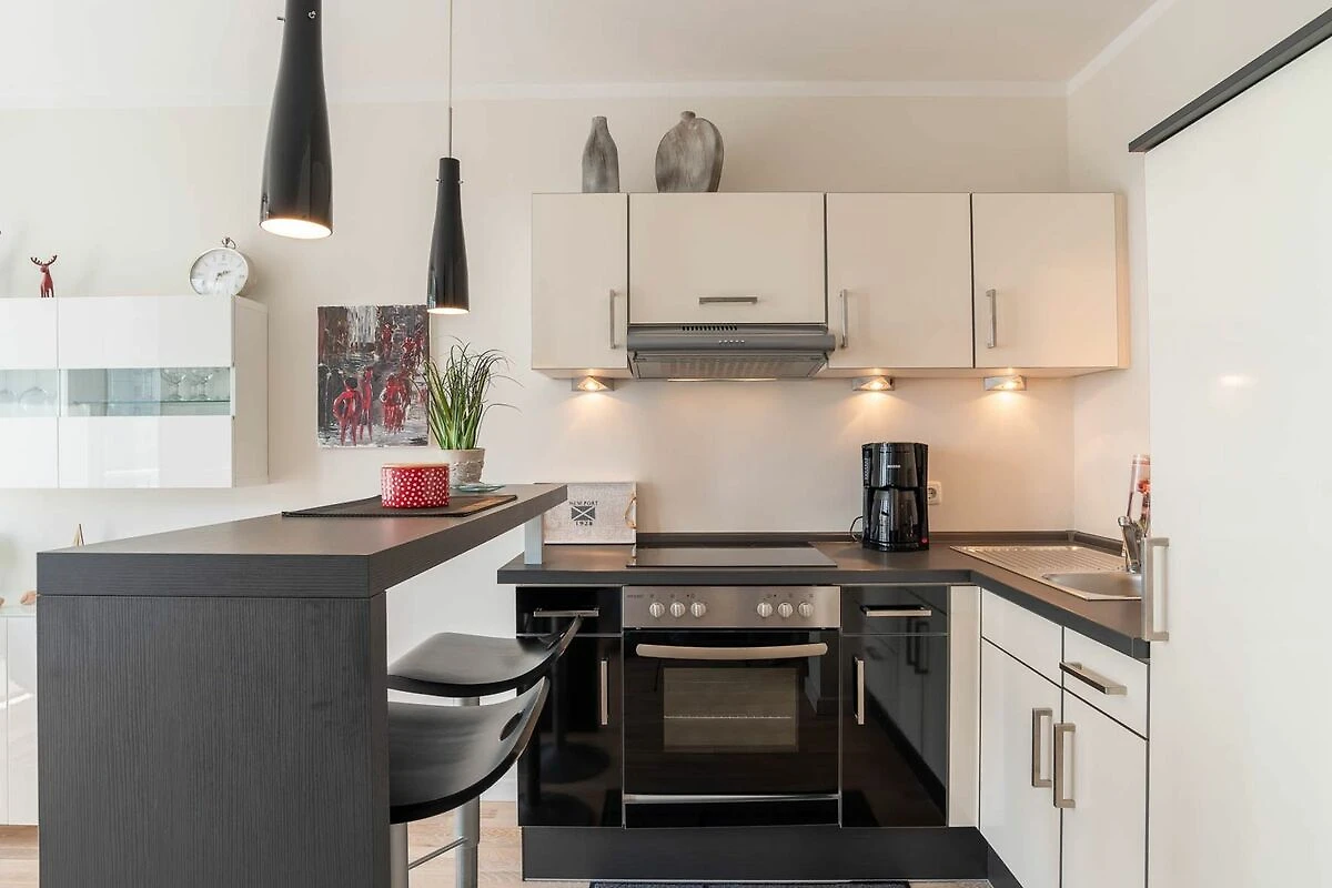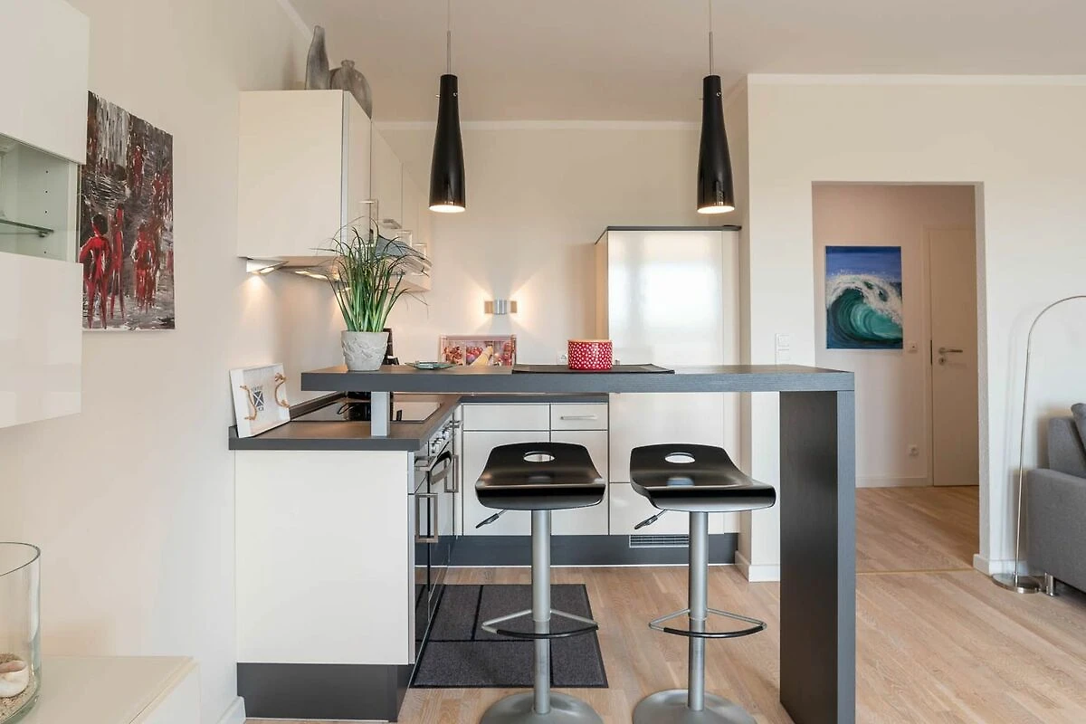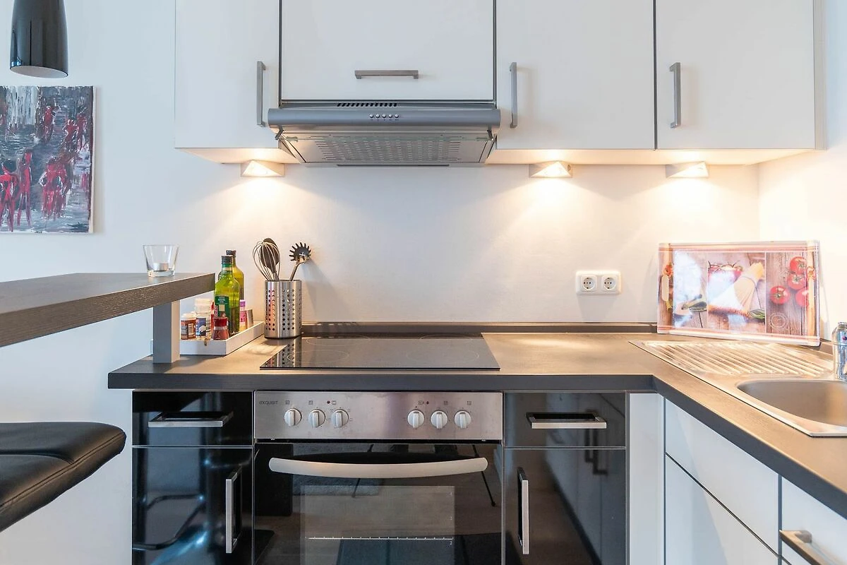 Die offene Küchenzeile wird optisch durch einen Küchentresen und zwei Barhockern vom Rest der Wohnung getrennt. Die moderne Küche ist komplett eingerichtet, und hat alles, was Sie zum Kochen brauchen: Es befindet sich in der Küche ein Ceran-Kochfeld mit Backofen und ein Kühlschrank mit Gefrierfach. Gläser, Porzellan, Töpfe und Besteck sind für 4 Personen vorhanden.