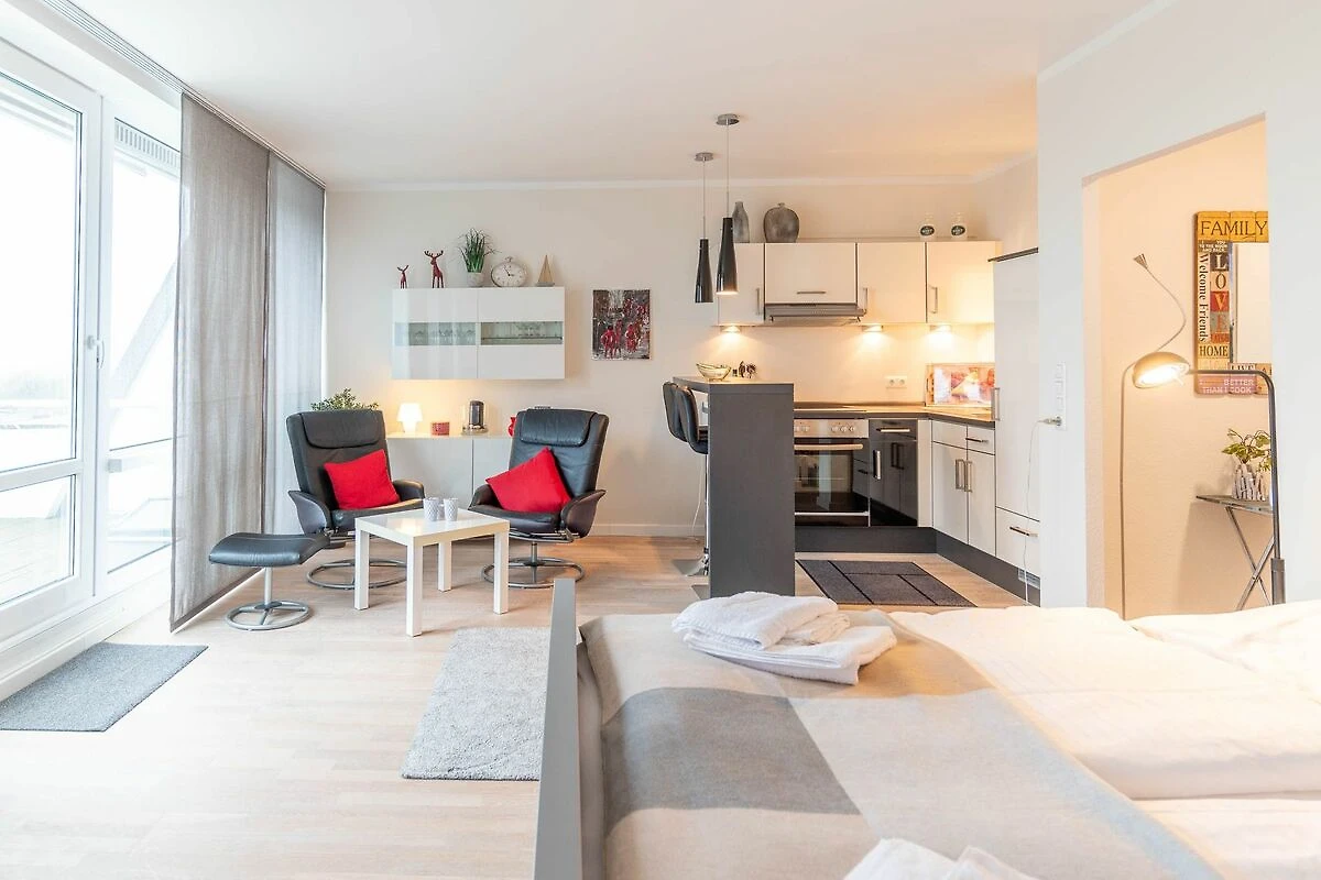Die bodentiefe Fensterfront sowie der helle Fussboden mit Parkettboden lässt die 1-Zimmer Ferienwohnung erstrahlen. Im gemütlichen Wohnbereich befindet sich zwei Sessel, sowie ein bequemes 180x200m Bett.