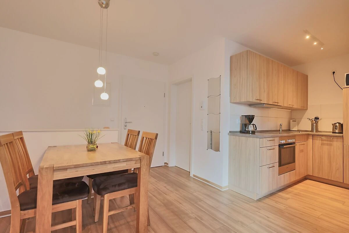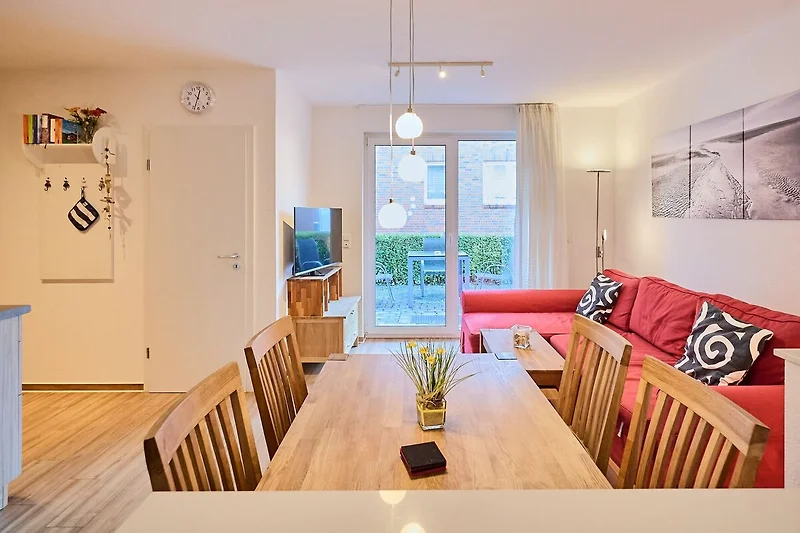 Der helle Wohnbereich, ausgestattet mit einer Eckcouch, mit dem Essbereich lädt ein zum abendlichen Zusammensein. Von hier aus kommen Sie auch auf die Südterrasse. Die Küche ist komfortable, unter anderem mit Geschirrspüler eingerichtet.