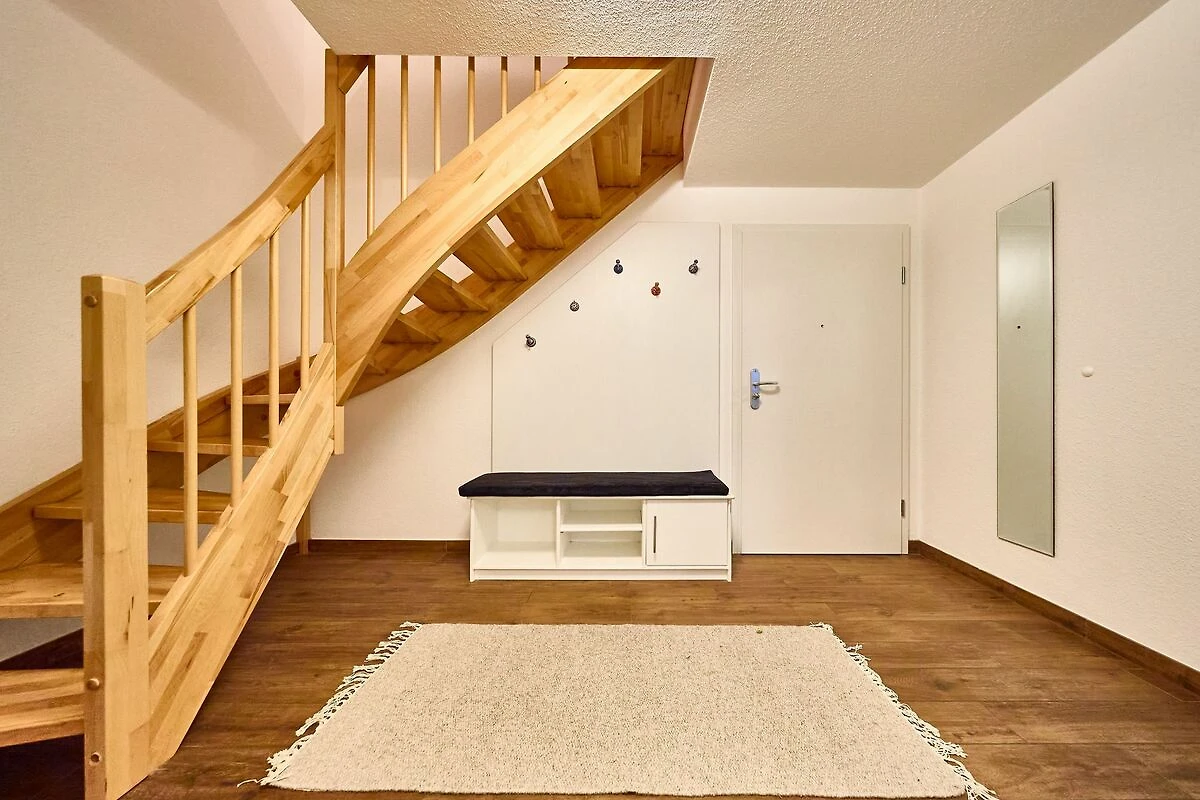 In den beiden separaten Schlafzimmern finden Sie insgesamt 4 Schlafgelegenheiten vor. Ein Schlafbereich mit einen Etagenbett, im Erdgeschoss für die Kids und ein Elternschlafzimmer mit Doppelbett im Untergeschoss. Ablagemöglichkeiten finden Sie in beiden Schlafbereichen vor. Auch befindet sich im unteren Flur zusätzlicher Platz für Schuhe und Garderobe. Viel Komfort auf kleinem Raum. Vom Untergeschoss aus können Sie auch gut in den Tag starten, da sich hier ebenso wie im Erdgeschoss eine gesicherte Wohnungseingangstür befindet.