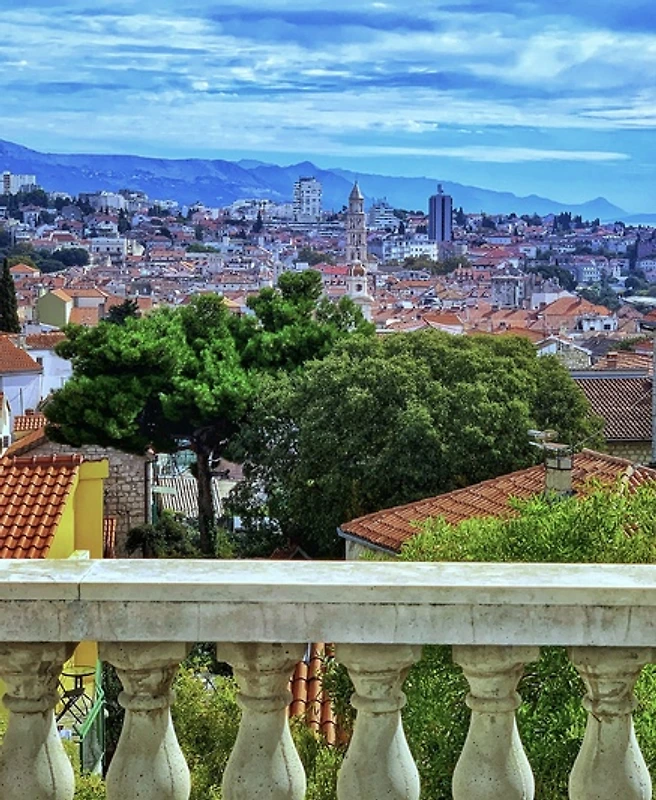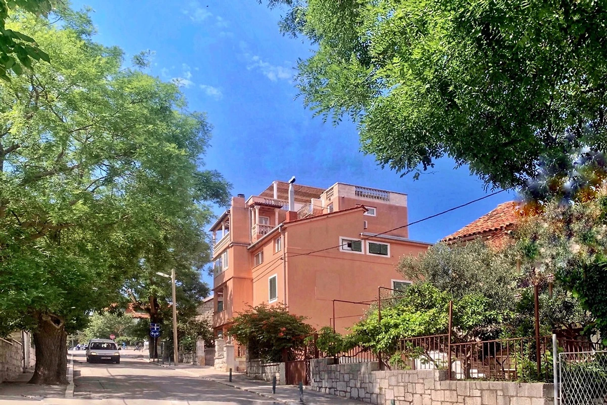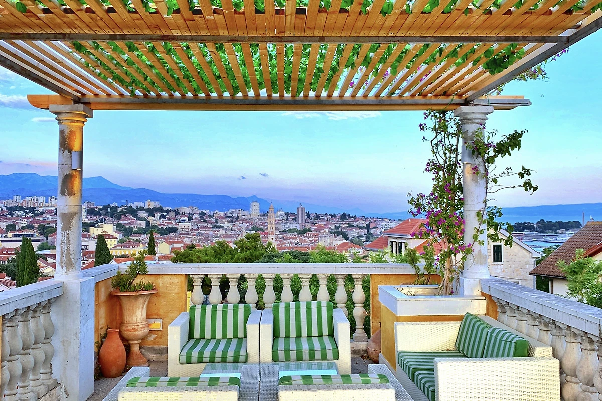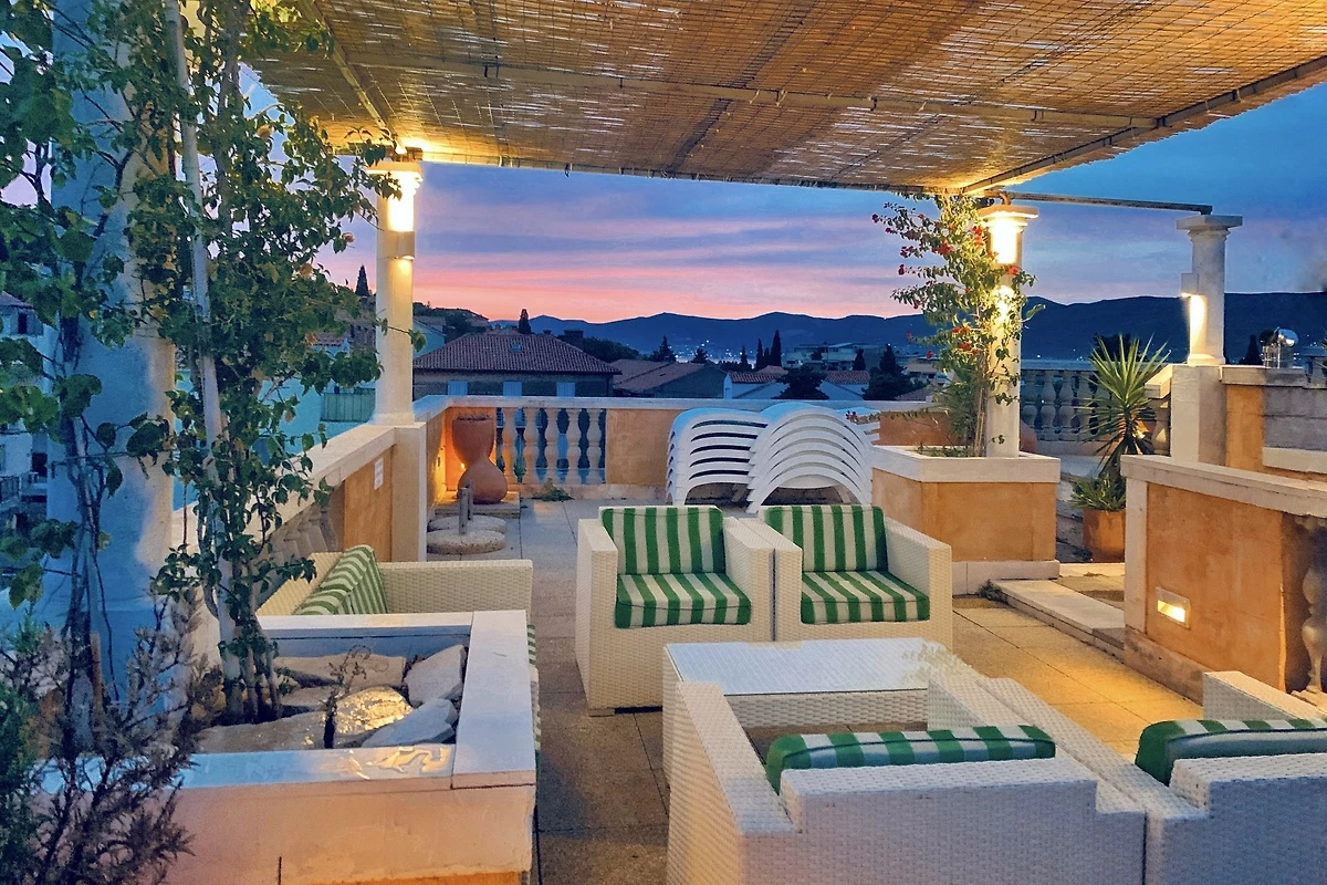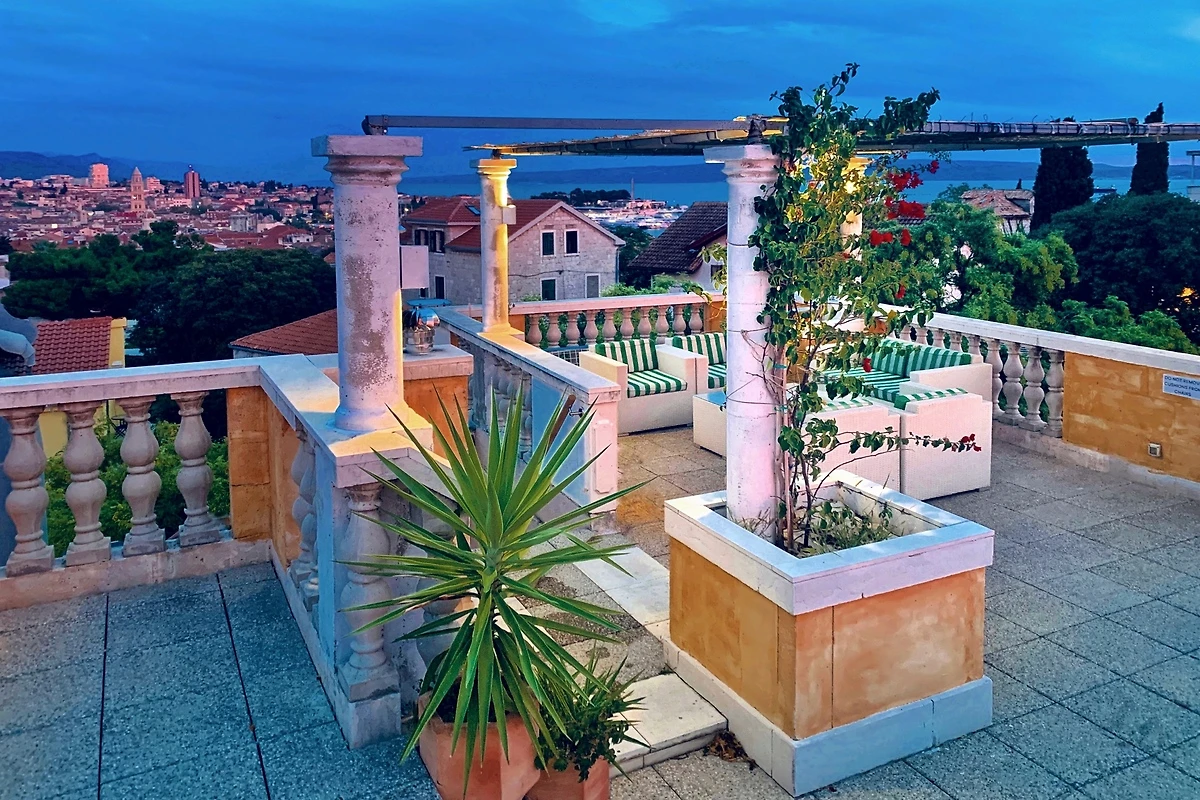 Dieses luxuriöse Duplex-Penthouse mit 3 Schlafzimmern ( 6 Personen) und 3 Badezimmern ( en-suite ) befindet sich im zweiten Stock der Villa der Familie. Es gibt auch eine große private Dachterrasse mit 360-Grad-Blick auf die Stadt, das Meer, die Inseln und die umliegenden Berge. 10 Gehminuten vom UNESCO-geschützten Diokletianspalast, der Promenade von Riva, dem Stadthafen und dem ACI-Yachthafen entfernt. 3 Schlafzimmer, 3 Badezimmer, Wohnzimmer, Esszimmer, voll ausgestattete Küche, Holzkohlegrill, Waschmaschine und Trockner, 2 Balkone, 50m2 Terrasse und kostenloser Privatparkplatz.