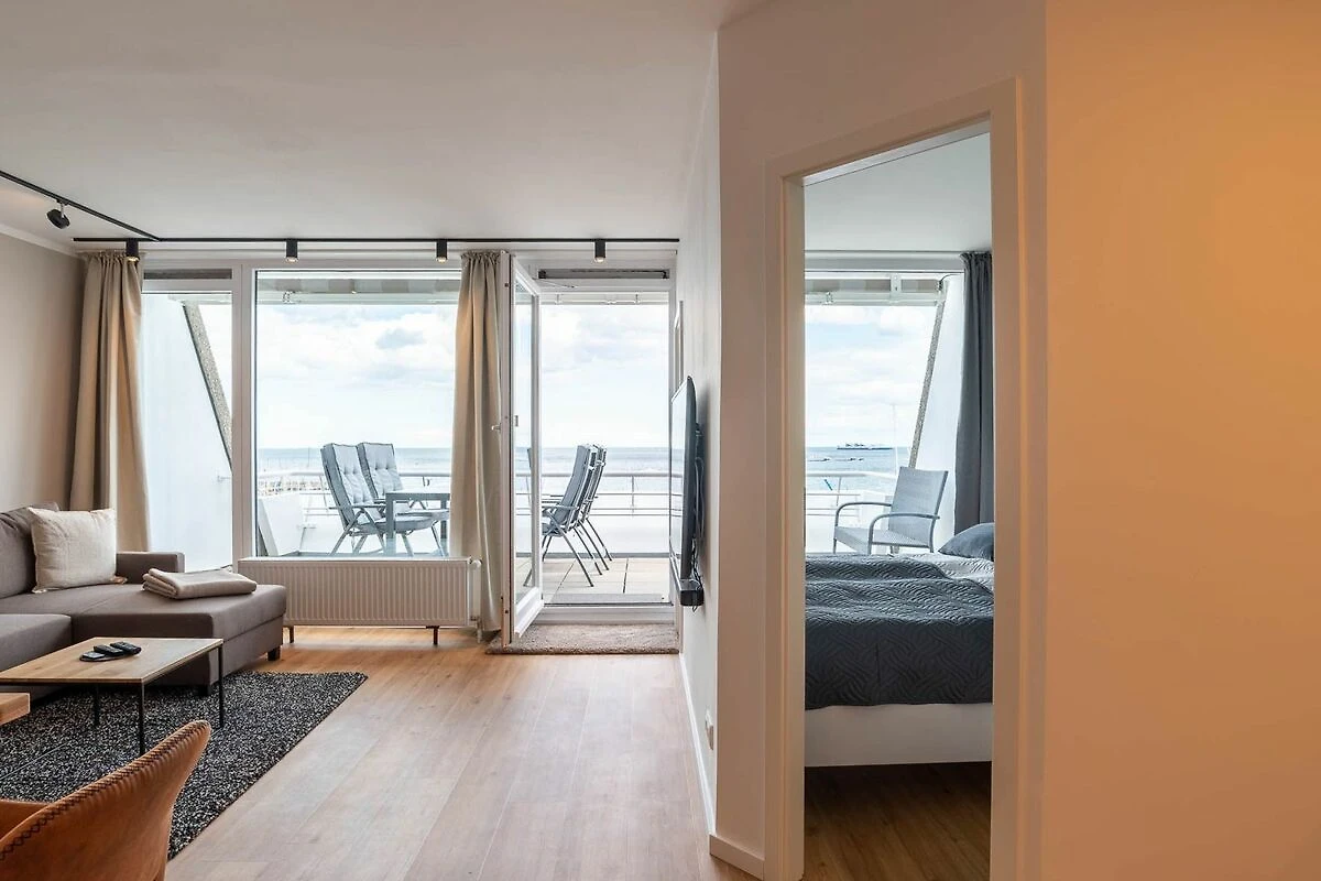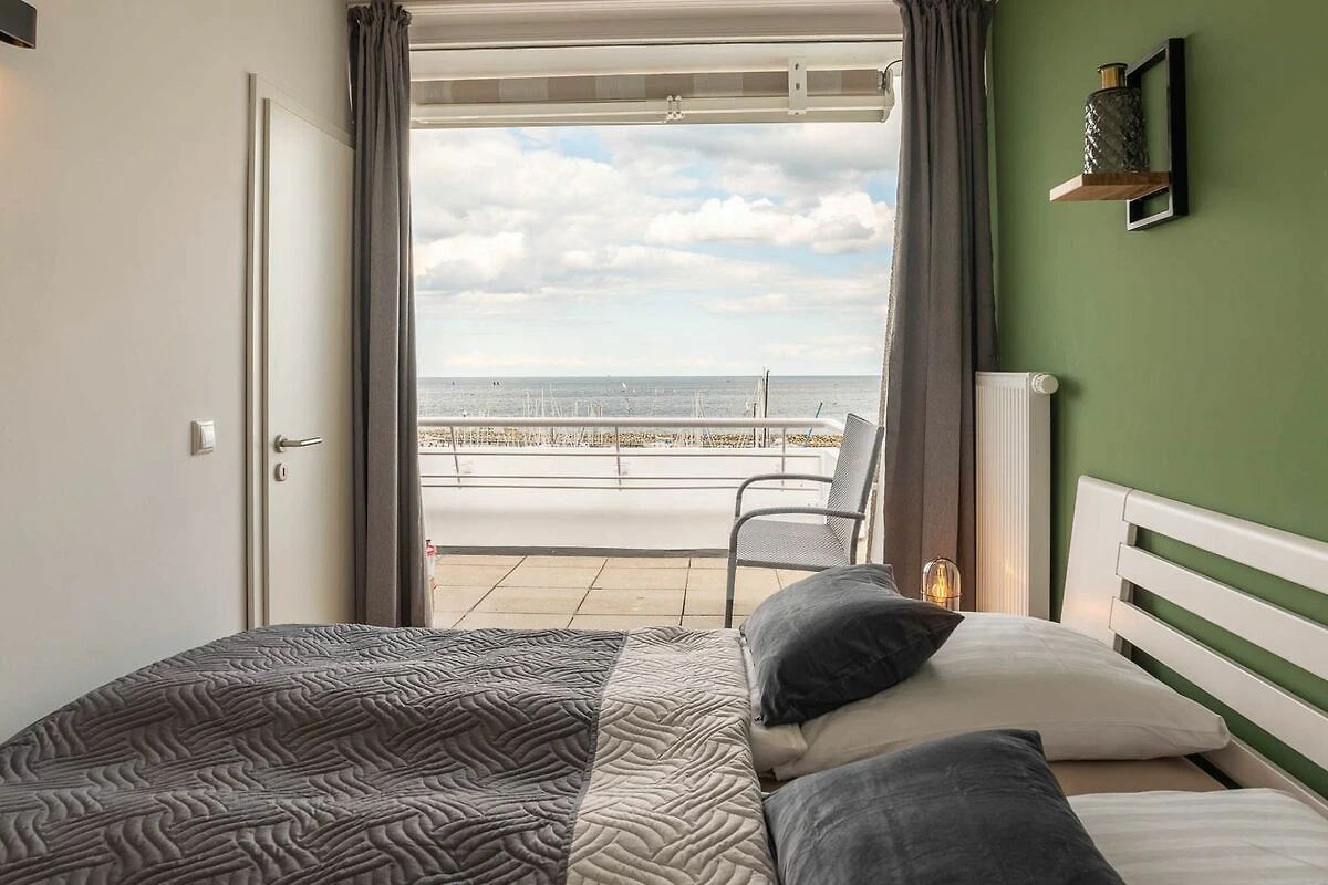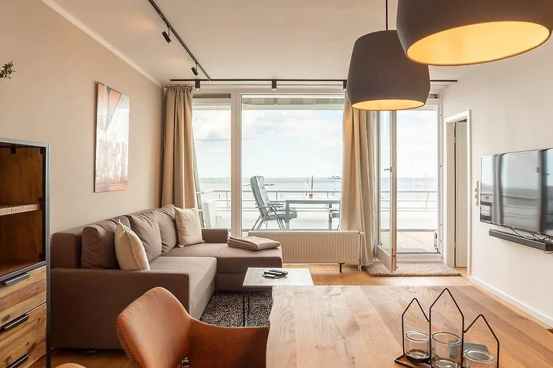 Die bodentiefe Fensterfront lässt das Apartment hell erleuchten. Nicht nur vom Balkon, sondern auch von jeder Sitzgelegenheit der Ferienwohnung hat man einen wunderbaren Blick auf den Hafen und die Ostsee.