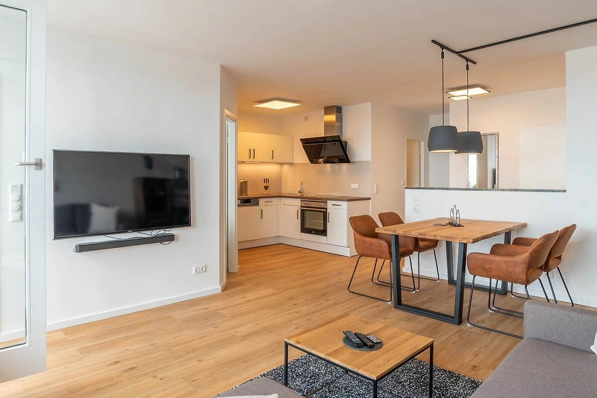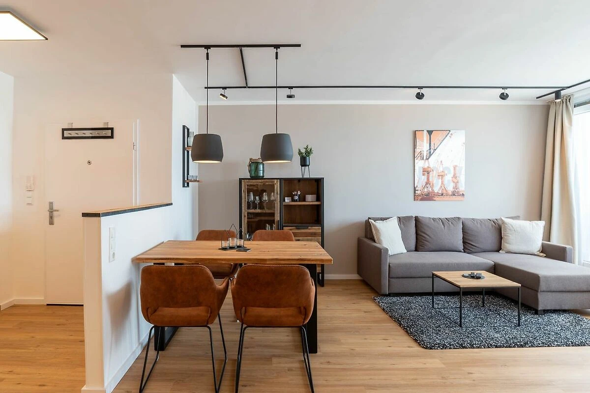 Vom Schlafzimmer ausgehend blicken Sie direkt auf den Wohnzimmerbereich des Apartments. Hier steht neben einer bequemen Couch, einem grossen Teppich auch ein Flatscreenfernseher sowie ein Radio für entspannte Abende zur Verfügung. Die Unterkunft lässt sich vollständig durch Gardinen abdunkeln. Mit ein paar Handgriffen lässt sich die Couch in ein vollwertiges Schlafsofa mit der Liegefläche von 160x200cm umbauen. Hier kann eine Person zusätzlich übernachten. Die schwarze Lichtleiste über den Wohn-, und Essbereich ist nicht nur ein Hingucker, sondern verleiht dem Apartment auch am Abend eine gemütliche Stimmung. Die Lightspots lassen sich unterschiedlich steuern und die Wand anstrahlen.