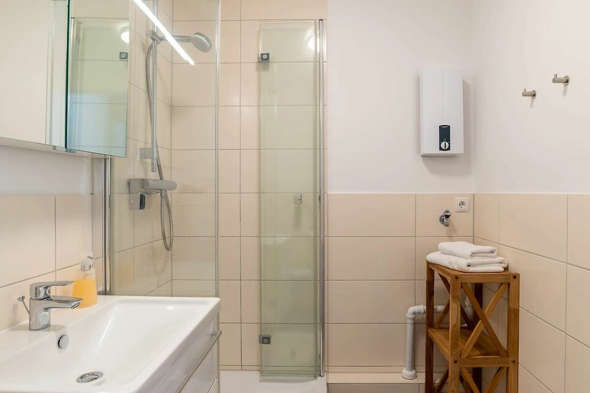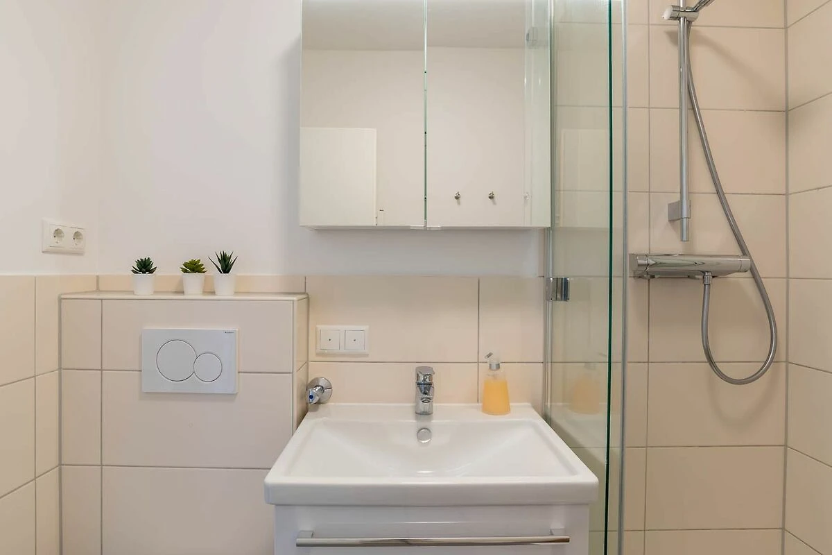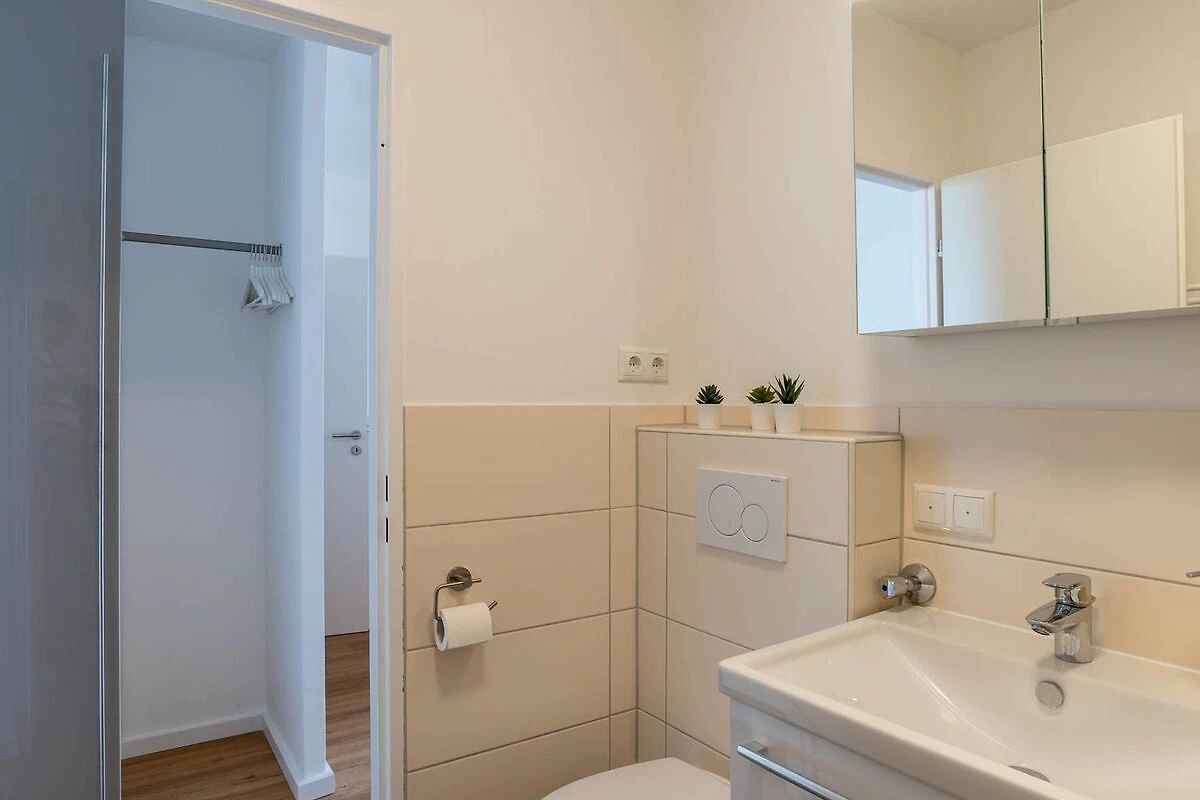 Am Eingangsbereich befindet sich eine kleine Abstellkammer, eine Garderobe und ein grosser Kleiderschrank sowie das moderne Badezimmer mit Dusche, WC und genügend Stauraum. Abseits des Badezimmers wurde in der gesamten Ferienunterkunft ein Holzboden verlegt, der dem Apartment eine gemütliche Atmosphäre verleiht.