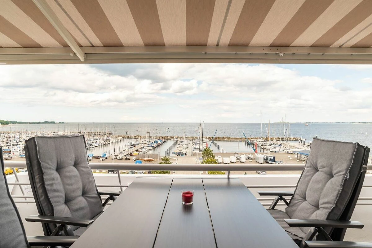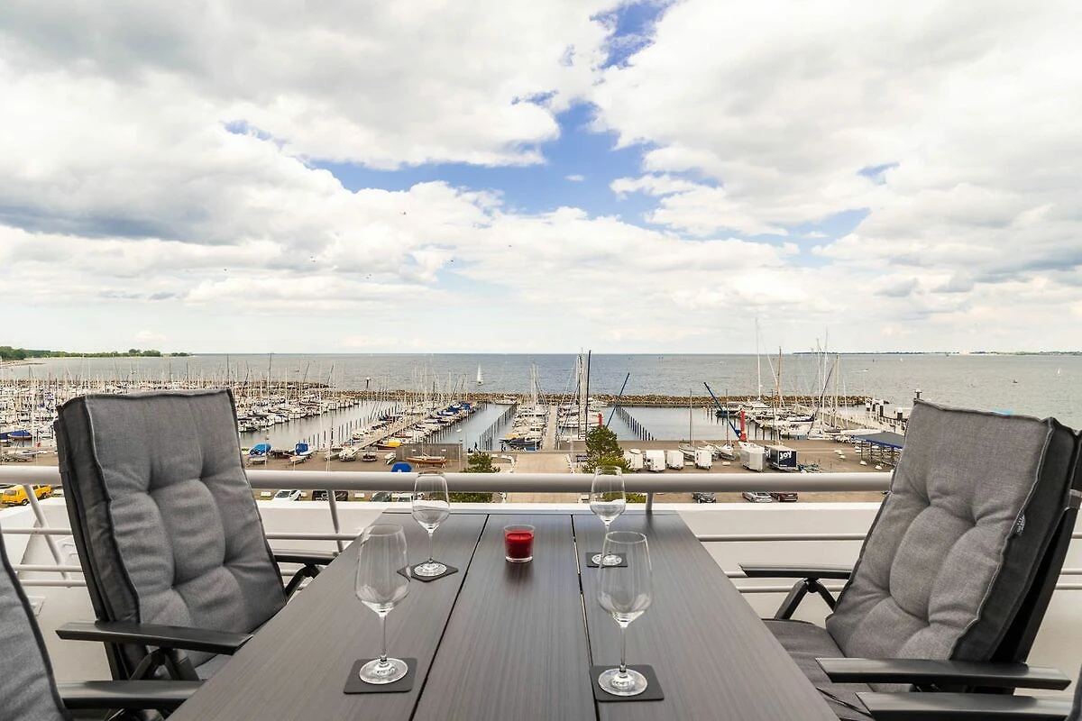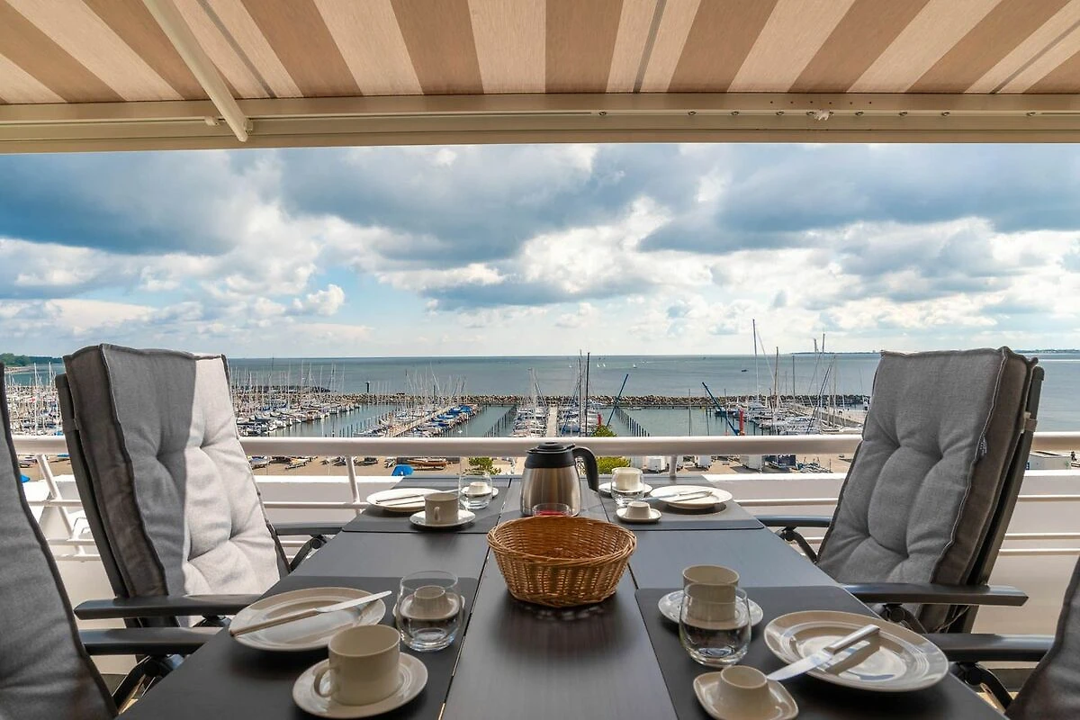 Der 12qm² grosse Balkon verfügt über einen robusten Gartentisch sowie vier Stühle und einer Gartenbank. Von hier lässt sich wunderbar der Hafen und das Treiben auf der Ostsee beobachten. Vor der Morgen- und Mittagssonne schützt eine ausfahrbare Markise.