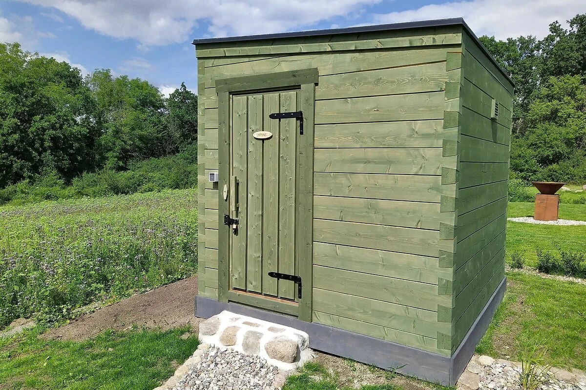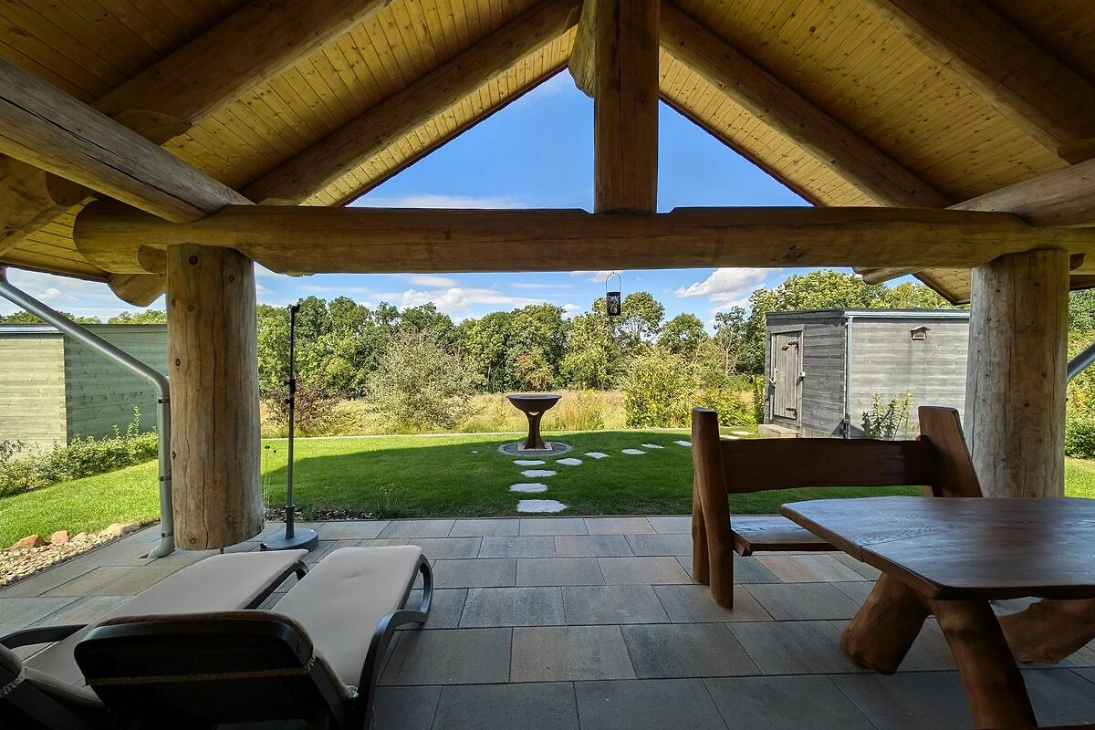 Exklusives Ferienhaus mit finnischem Saunahaus und komplett überdachter Terrasse.