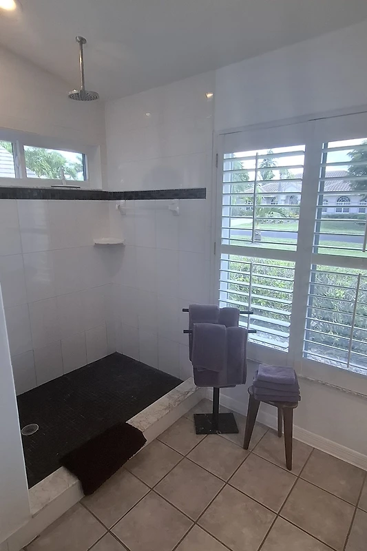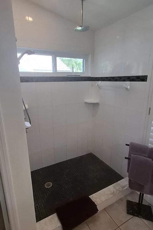 Ihr Gästebadezimmer verfügt über eine begehbare Dusche, einen neuen hellen weissen Waschtisch mit Granitoberflaeche und liegt zwischen beiden Gästeschlafzimmern im Gästetrakt auf der anderen Seite der Villa. Ideall ist diese Raumauflösung wenn Sie mit befreundeten Paaren zusammen verreisen und jeder seinen separaten Bereich haben möchte.