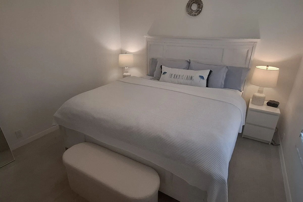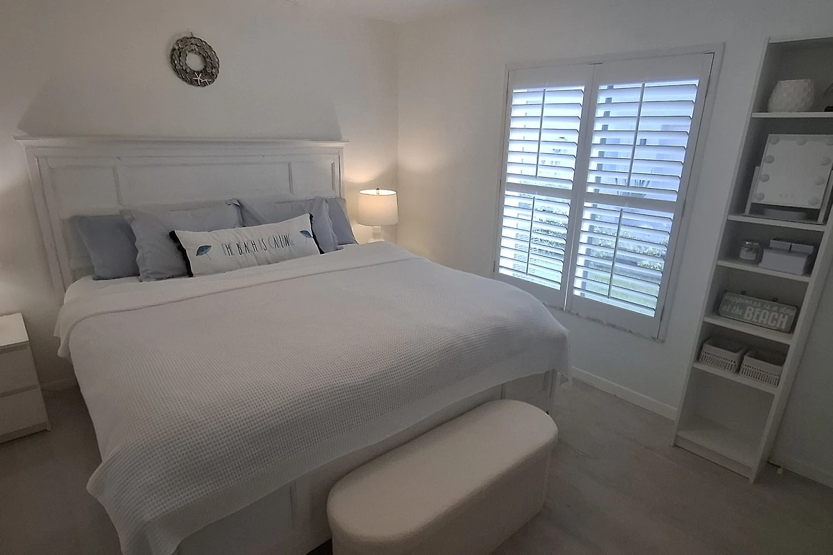 Gästezimmer 2 verfügt ebenfalls über ein Queen Size Bett im hell weissen Coastal Beach Style.