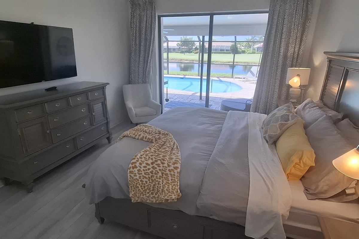 Im Masterschlafzimmer steht Ihnen ein King Size Bett zur Verfügung mit angenehmer Pillow Top Memory Foam Matratze. Ebenso verfügt es über einen eigenen LED Flachbildschirm mit Kabelanschluss und besticht durch seinen überaus großzügigen Blick auf den wahlweise beleuchteten Pool und den tropischen Garten mit Seeblick.