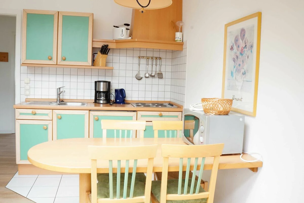 Die Wohnung verfügt über ein Schlafzimmer mit zwei Einzelbetten, Kleiderschrank und riesigem Atelierfenster mit Meerblick und ein Wohnzimmer mit mit Sitzecke (Doppelschlafsofa) , TV und Essecke. Eine komplett eingerichtete Küchenzeile (4-Plattenherd, Kühlschrank, Mikrowelle, Kaffeemaschine, Toaster, komplett Geschirr, etc.) als auch Dusche und WC gehören zur Wohnung.
