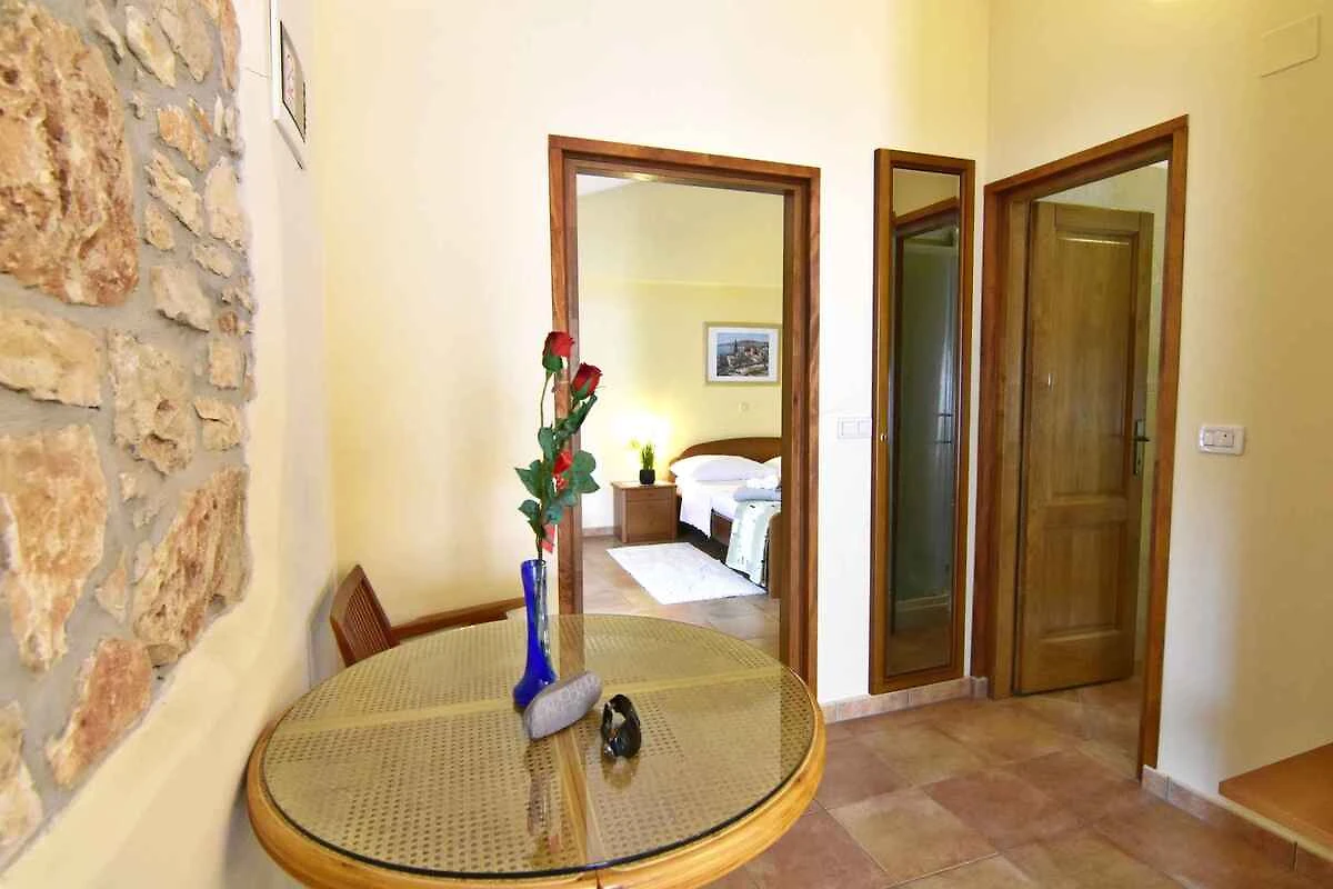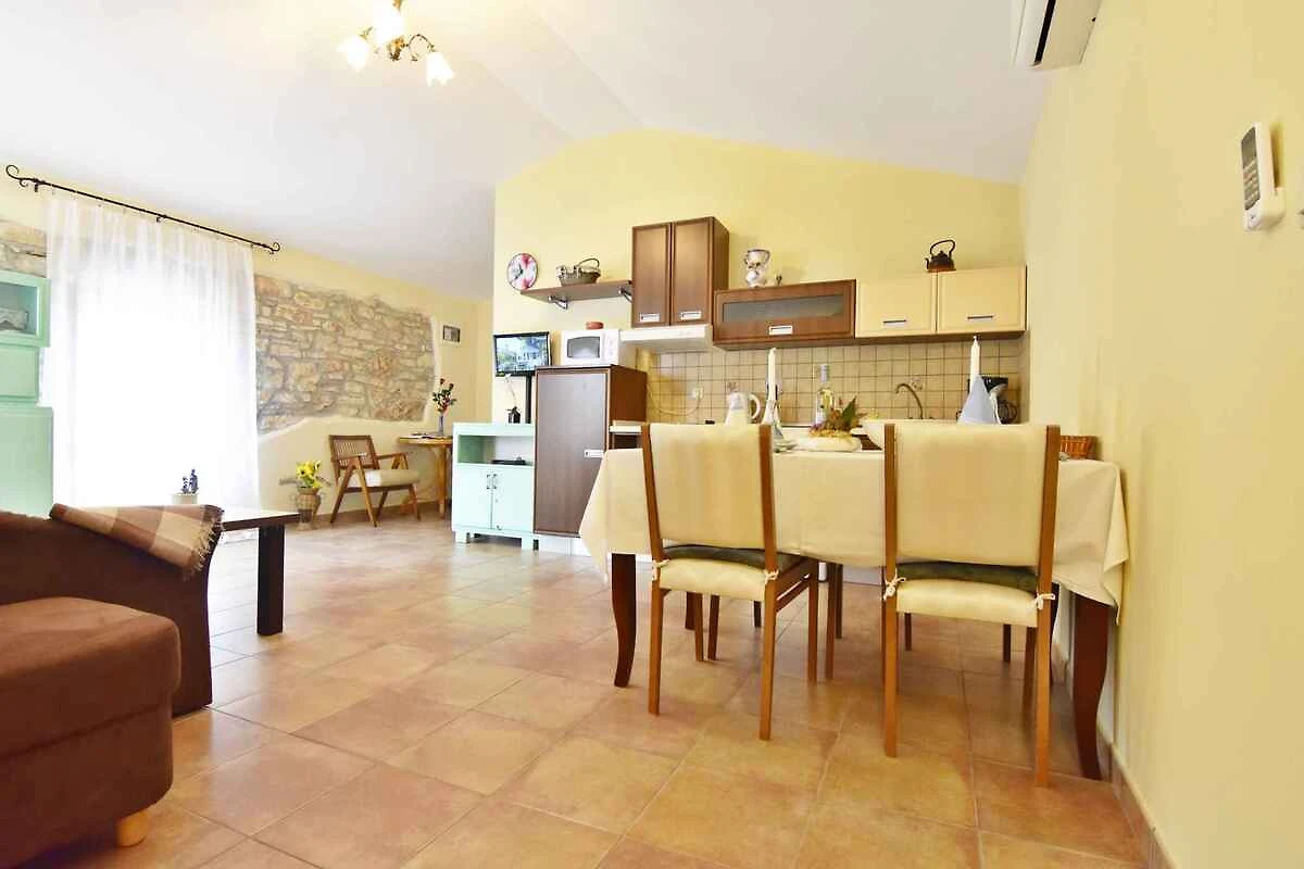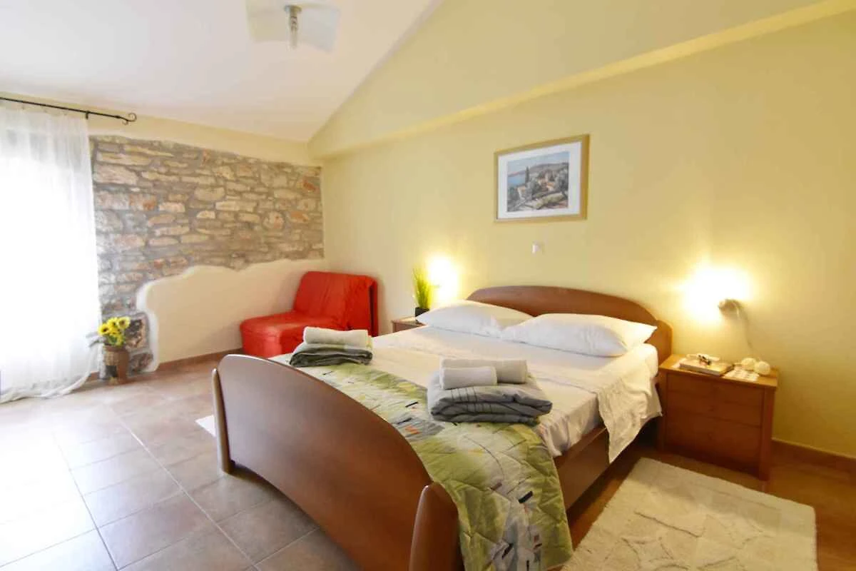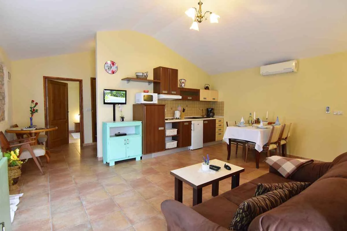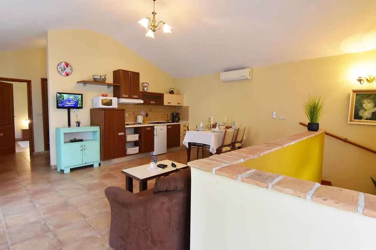 Tar/Poreč. Die Ferienwohnung befindet sich auf einem geschlossenen Grundstück mit Blumen und Bäumen, von einem Zaun begrenzt. Der Vermieter wohnt nicht im Haus oder auf dem Grundstück. Die Zufahrt erfolgt über eine Nebenstrasse (asphaltiert). Parkplatz auf dem Grundstück, der Strasse vor dem Haus und einem Parkplatz im Ort (Entfernung 50 m).