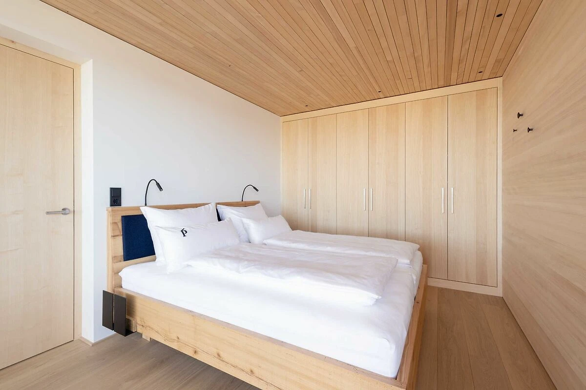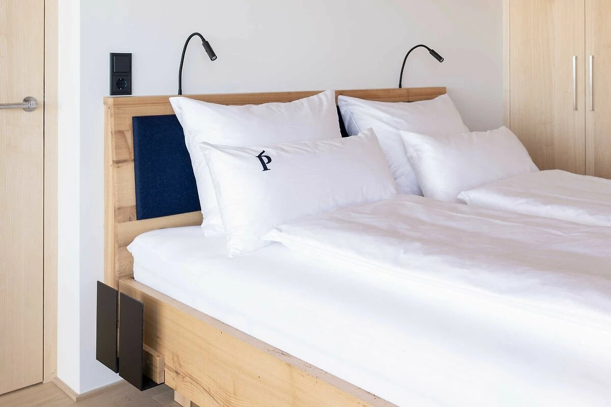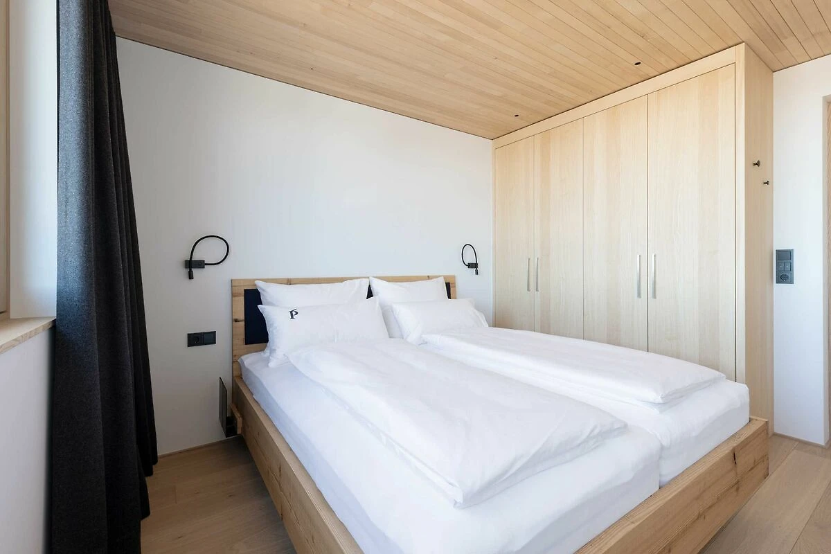 Bregenzerwälder Architektur und Handwerk gepaart mit modernen Designklassikern. Holzbalken von Poldi‘s altem Haus neuverarbeitet zu zeitlosen Betten. Besondere und warme Atmosphäre durch gebürsteten Eichenboden, heimische Weisstannenwände und spezielles Lichtdesign.