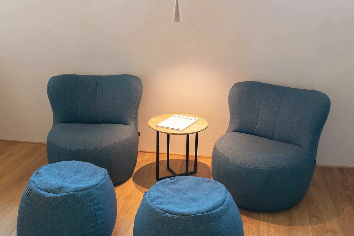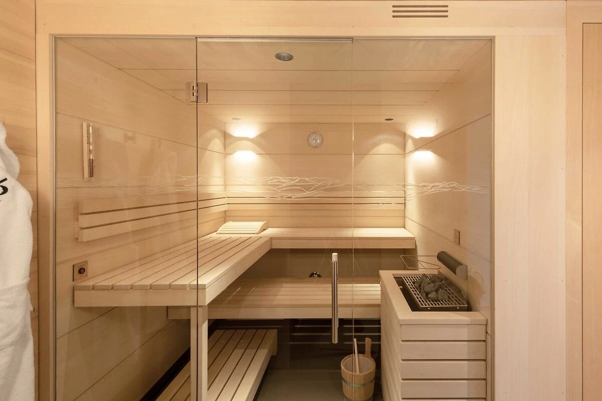 Wir bieten - Zwei Apartments, je 52 m2, mit Panoramabalkon/Schopf. Obergeschoss, Untergeschoss – gleichwertig wertvoll. Carport und einen liebevollen Vorhof mit Spielbereich, Trinkwasserbrunnen und Sitzecke. Ein Reich der Erholungspause: Lindenholz-Sauna mit Dusche, Ruheraum mit Teebar.