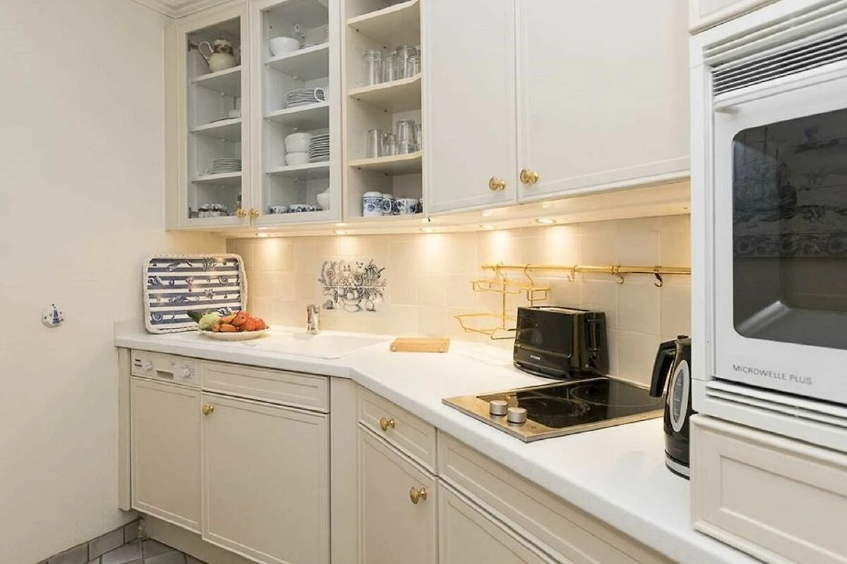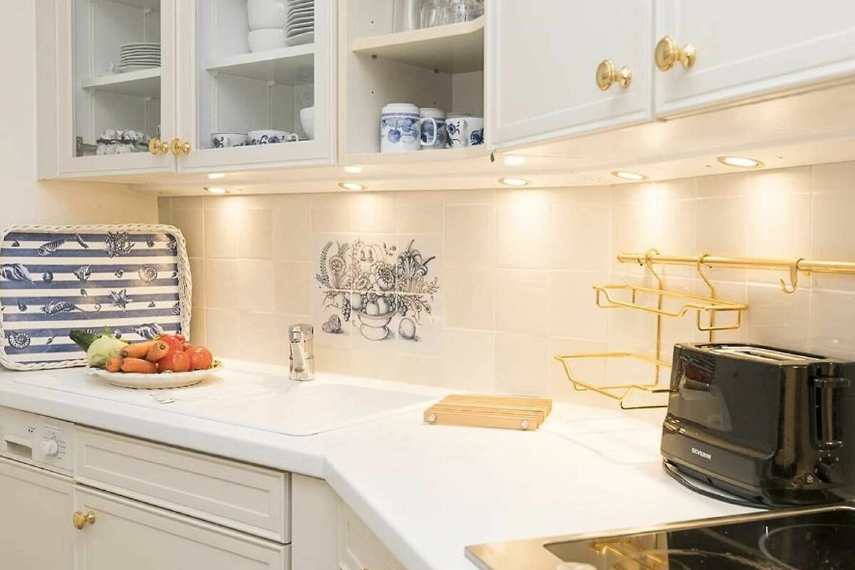 Separate Küche mit 2-Platten-Ceran-Kochfeld, Backofen, Mikrowelle, Kühlschrank mit Gefriermöglichkeit, Geschirrspüler, Filter-Kaffeemaschine, elektrischer Wasserkocher, Toaster und Geschirr für den täglichen Bedarf sind selbstverständlich.
