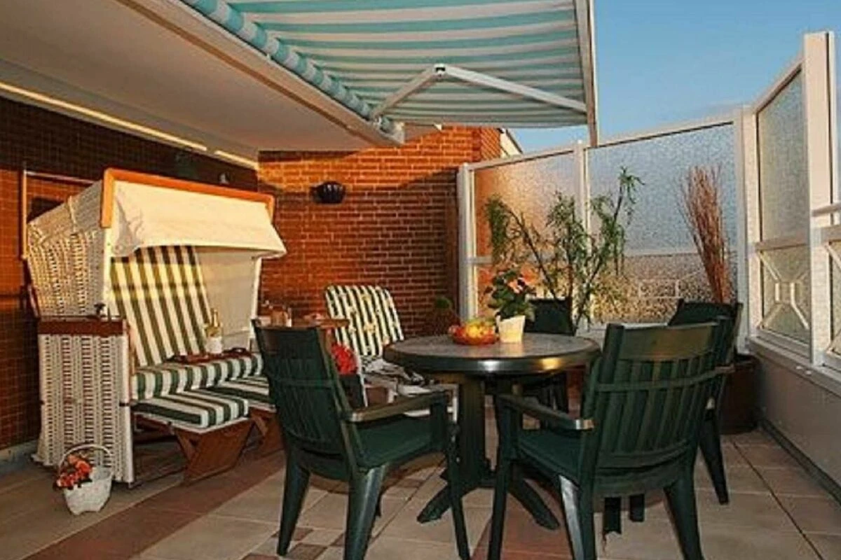 Eine grosse Dachterrasse (25m²) mit Sylter Strandkorb und Gartenmöbeln sowie elektrischer Markise mit Süd/West Lage lädt zum Entspannen ein.