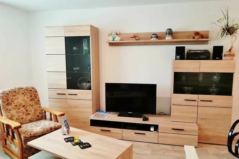 Wir bieten Ihnen ein Wohnzimmer (Durchgangszimmer) offen zur Küche und zum separaten Schlafzimmer. Wohnzimmer mit Flachbildschirm, Plattenspieler, Sitzecke und ein Bett. Schlafzimmer mit französischem Bett (1,40m) und Kleiderschrank. Küche mit Küchenzeile, Induktionsherd, Backofen, Mikrowelle, Spüler und Esstisch. Bad mit WC und Badewanne. Handtücher und Bettwäsche vorhanden. Auch ein moderner Waschtrockner steht im Flur zur Verfügung.