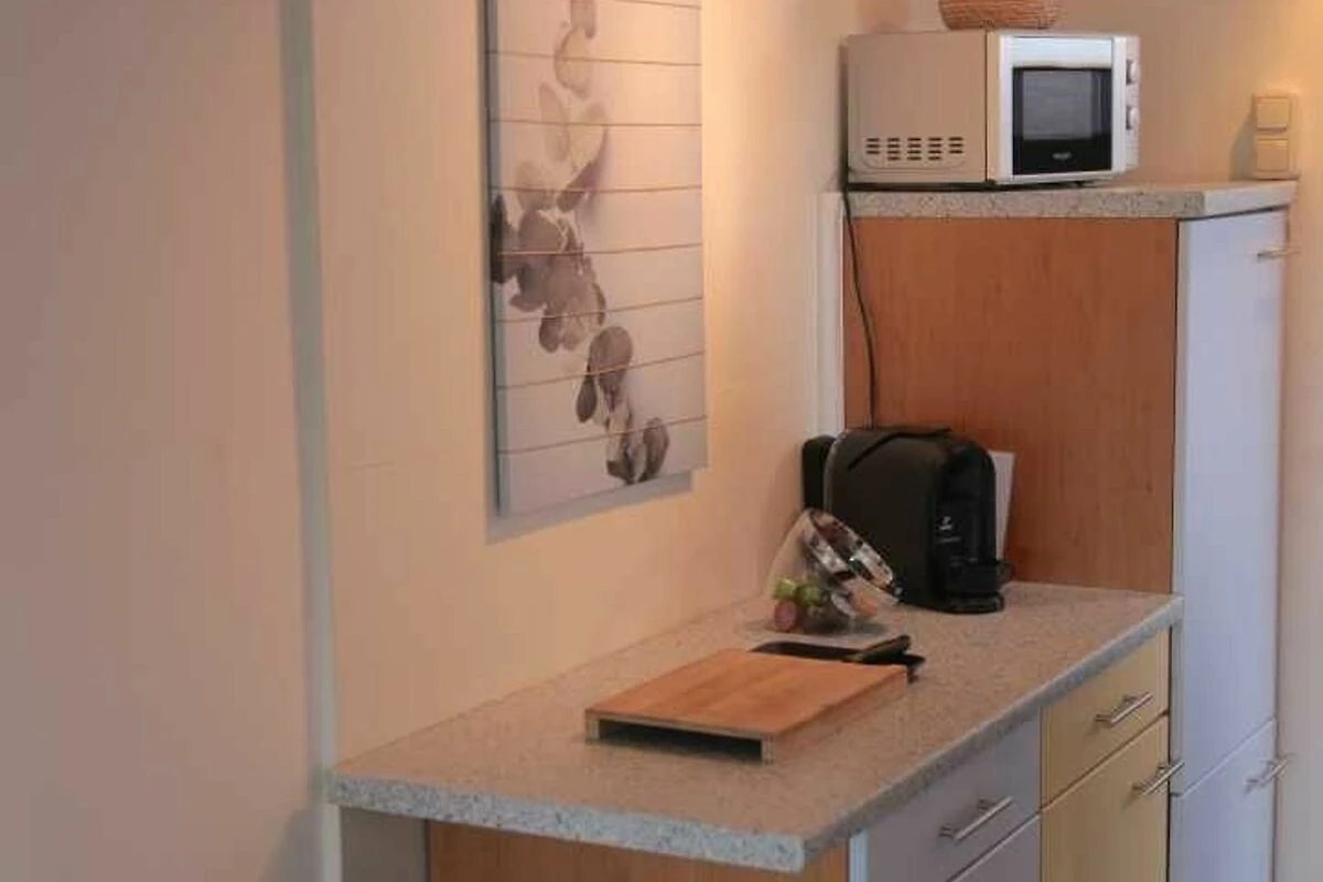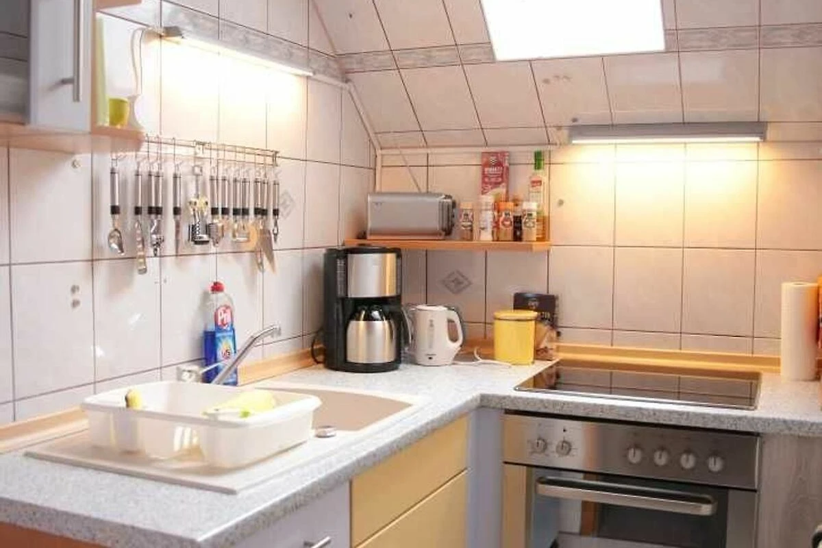 Kaffeemaschine, Tabs- Kaffeemaschine, Wasserkocher, Mikrowelle, Herd mit Backofen, Kühlschrank mit Gefrierfach. Das notwendige Geschirr sowie Geschirrtücher sind vorhanden, um nur einiges zu nennen.