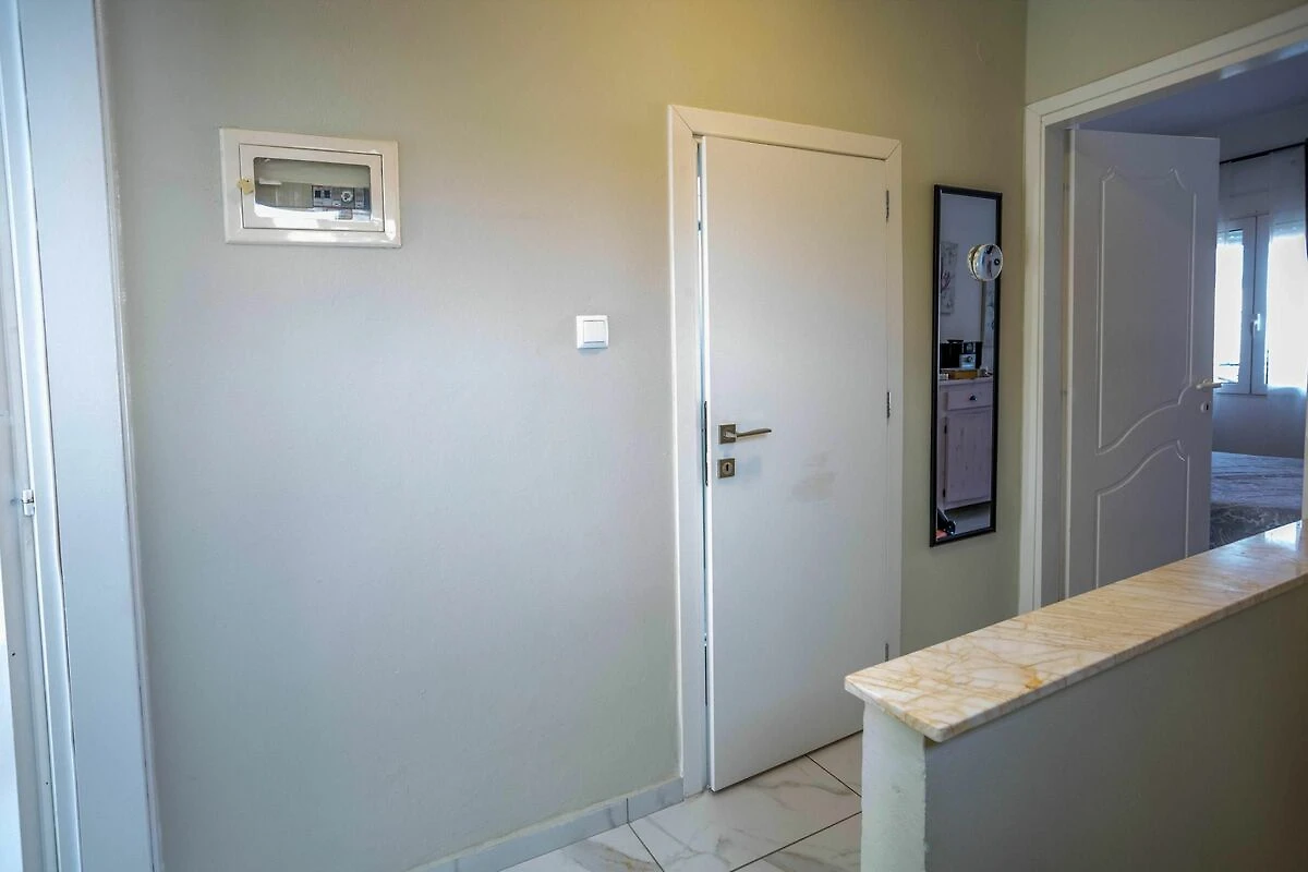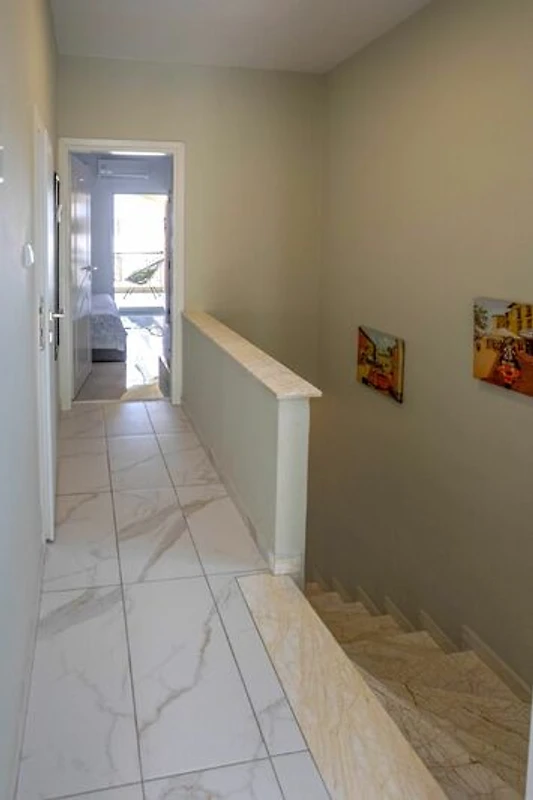 Das dreistöckige, gepflegte Ferienhaus LITSA (linke Haushälfte) besteht aus dem Haupthaus im 1. und 2. Stock und der kleinen Einliegerwohnung im Erdgeschoß. Der Zugang zum Haupthaus geht über Stufen. An das Wohnzimmer im 1.Stock schließt sich die halboffene Küchenecke und das Gäste-WC an. Vom Wohnzimmer geht es auf eine vordere, überdachte Terrasse. Im 2. Stock sind 2 Schlafzimmer und das gemeinsame Bad. Ein Schlafzimmer hat einen direkten Ausgang auf eine eigene, vordere Terrasse mit schönem Meerblick. Das zweite Schlafzimmer hat einen rückwärtigen, kleinen Balkon.