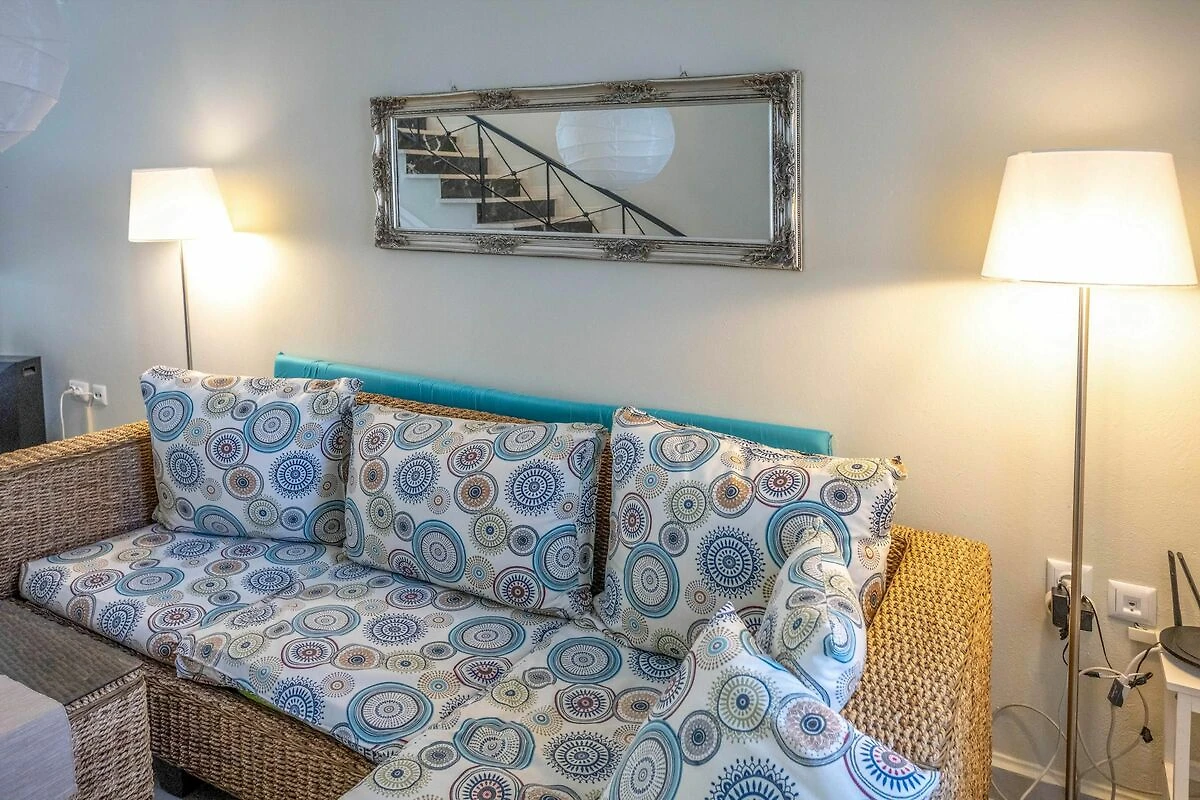 Im Erdgeschoß des Ferienhauses, mit eigenem Eingang, liegt die im Jahr 2018 ausgebaute Einliegerwohnung für 2 Personen. Sie besteht aus einem offenen Wohn-Schlafraum mit angrenzender Küchenecke und einem Bad. Vor der Wohnung sind eine kleine Terrasse und der Garten des Hauses. Diese kann separat gemietet werden.