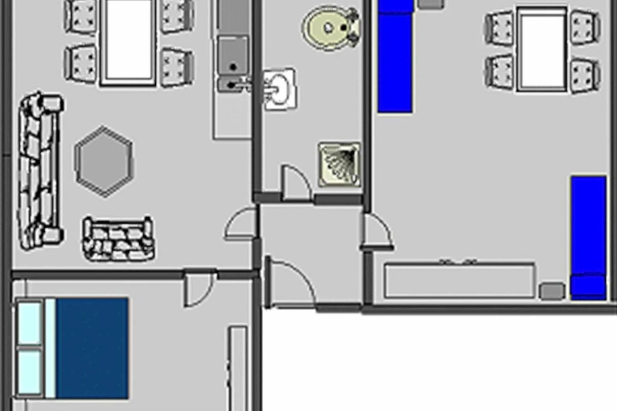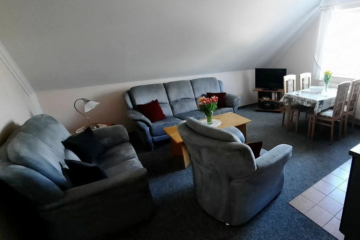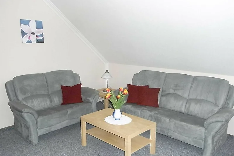 Die Wohnung verfügt auf ca. 55 qm über einen Wohnraum mit vollausgestatteter Küchenzeile, (Toaster, Kaffeemaschine, Wasserkocher, Backofen, Mikrowelle usw.), Couchgarnitur, Kabel-TV und Stereoanlage, 2 getrennte Schlafräume mit jeweils 2 Betten, Dusche / WC und Flur, vervollständigen diese für 2-4 Personen ausgestattete Wohnung