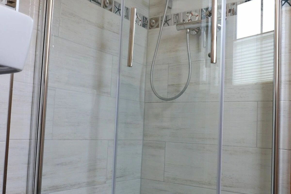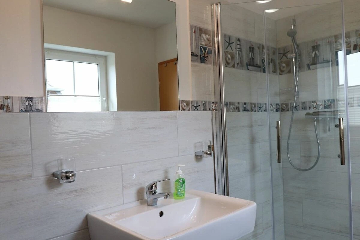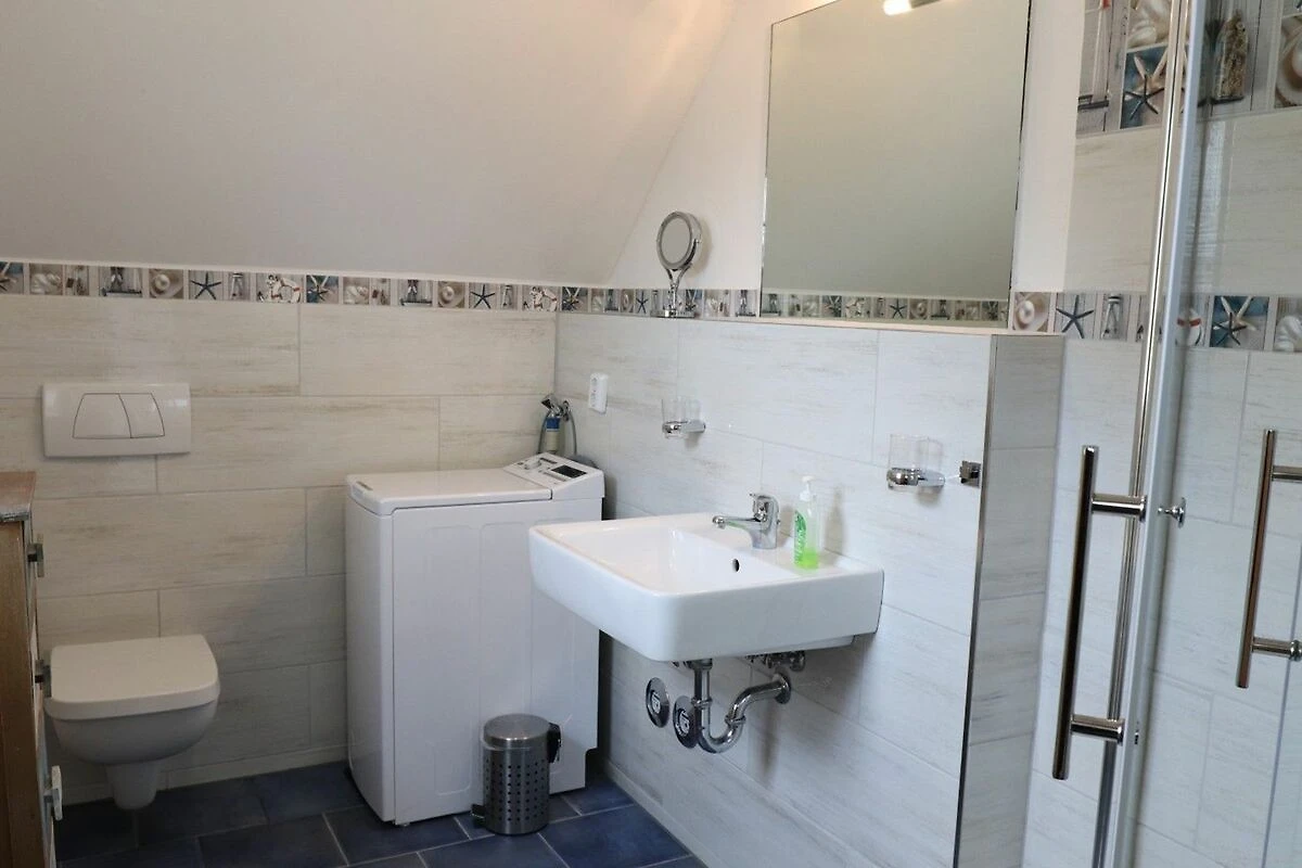 Das helle Tageslicht-Bad ist mit einer Dusche, einem WC und einer Waschmaschine ausgestattet.