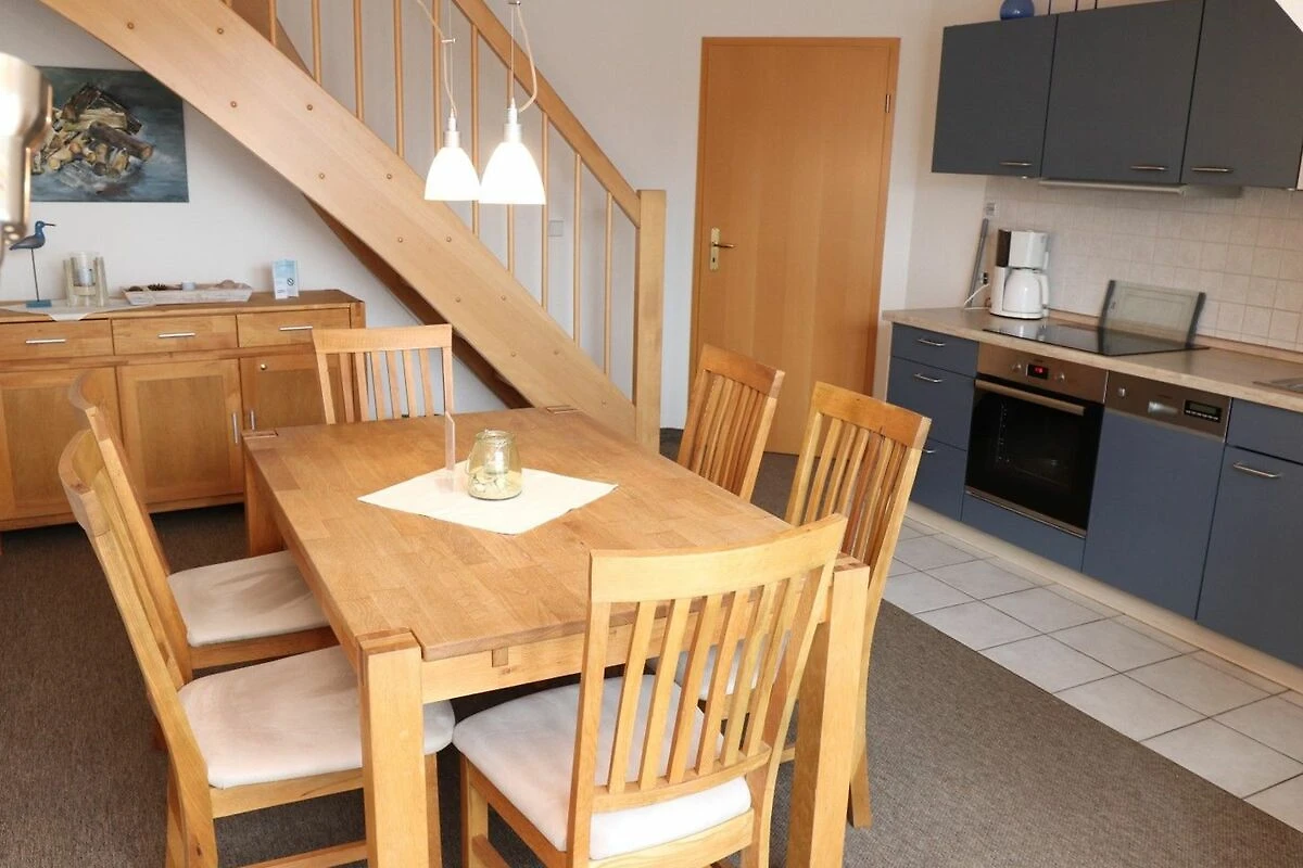 Die Wohnküche ist mit einer grossen Essgruppe und einer komplett eingerichteter Einbauküche ausgestattet.