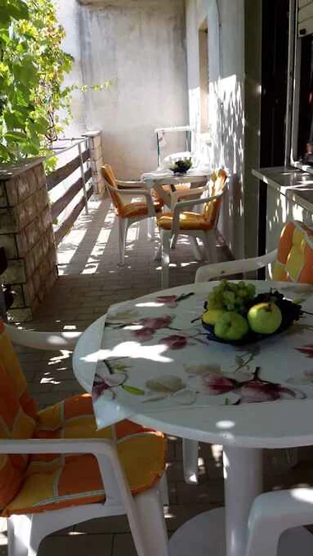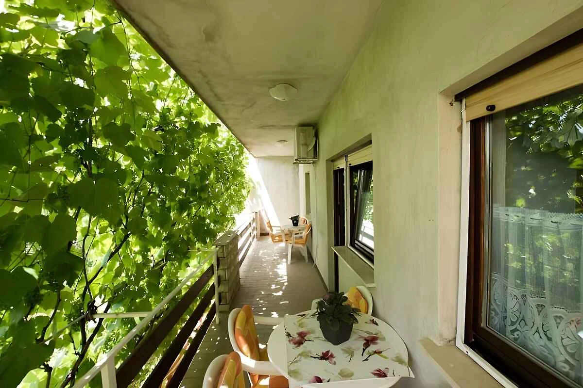 , ist überdacht und führt direkt in den Flur. Wohnzimmer (16 qm, Durchgangszimmer) mit 2 Zusatzbetten auf Sitzecke, Sitzecke, TV, Klimaanlage, Essecke (6 Plätze) und Zugang zum Balkon (15 qm, überdacht, Gartenmöbel, 2 Tische, 6 Stühle). Schlafzimmer (10 qm) mit 1 Doppelbett und Zugang zum Balkon (15 qm, überdacht, Gartenmöbel, 2 Tische, 6 Stühle). Schlafzimmer (12 qm) mit 1 Doppelbett. Küche (7 qm) mit Gasherd (2 Flammen), Elektroherd (Induktionsherd, 2 Platten), Backofen, Dunstabzugshaube, Geschirrspüler, Kühlschrank (Eisfach), Mikrowelle, Kaffeemaschine, Toaster, elektrischem Wasserkocher, Zugang zum Balkon und Radna kuhinja u sklopu dnevnog boravka , ulaz u dnevni boravak koji je prolazna soba i za spavaču sobu. Bad (4 qm) mit Dusche, 1 Waschbecken, WC und Bidet. Bad (3 qm) mit Waschmaschine, Dusche, 1 Waschbecken und WC.
