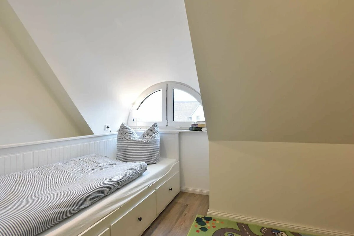 Im Obergeschoss insgesamt 5 Schlafräume, Babybett aufstellbar. Davon Schlafraum 2 und 3 mit Doppelbett & TV. Schlafraum 4 und 5 mit 2 Einzelbetten. Schlafraum 6 mit 1 Einzelbett.