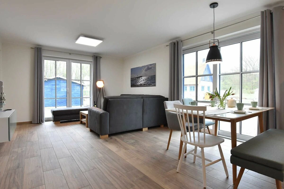 Im Erdgeschoss grosszügiger Wohn-/ Essbereich mit Esstisch und integrierter Küche mit Backofen, 4-Platten-Herd, Mikrowelle, Geschirrspüler, Kühl-/ Gefrierkombination, Kaffeemaschine ausgestattet. Im EG ein Schlafraum mit 1 Doppelbett (1,80 x 2 m). Gäste-WC.