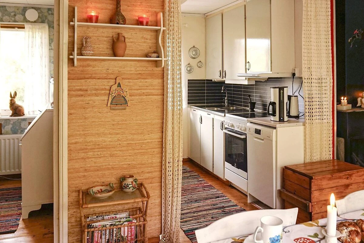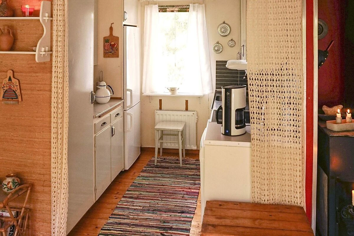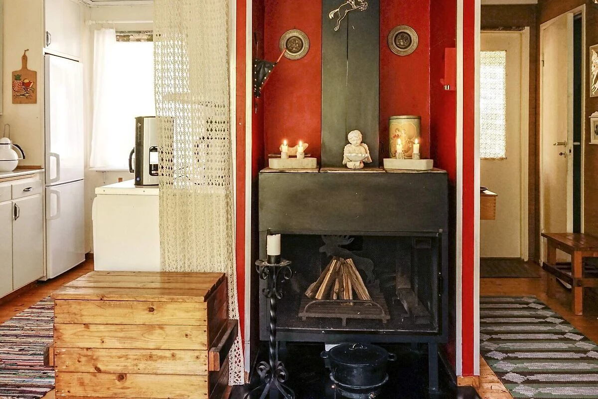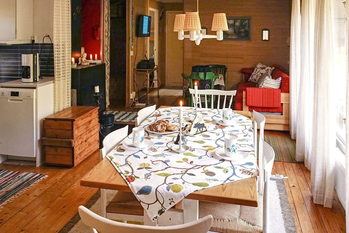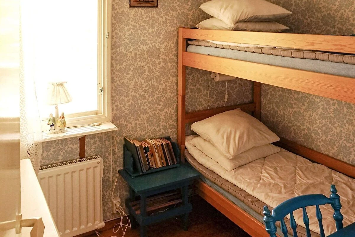 Offene Küche(Kochherd(elektrisch), Dunstabzugshaube, Kaffeemaschine, Mikrowelle, Spülmaschine, Kühl-/Gefrierkombination, Hochstuhl, Wasser vom Brunnen), Wohn-/Schlafzimmer(TV(schwedische Fernsehsender), Kaminofen), Schlafzimmer(Doppelbett), Schlafzimmer(2x Etagenbett), Schlafzimmer(2x Etagenbett), Badezimmer(Trockner, Waschbecken, Dusche, Toilette, Waschmaschine), Heizung(elektrisch), Terrasse, Gartenmöbel, Grill, Parkplatz