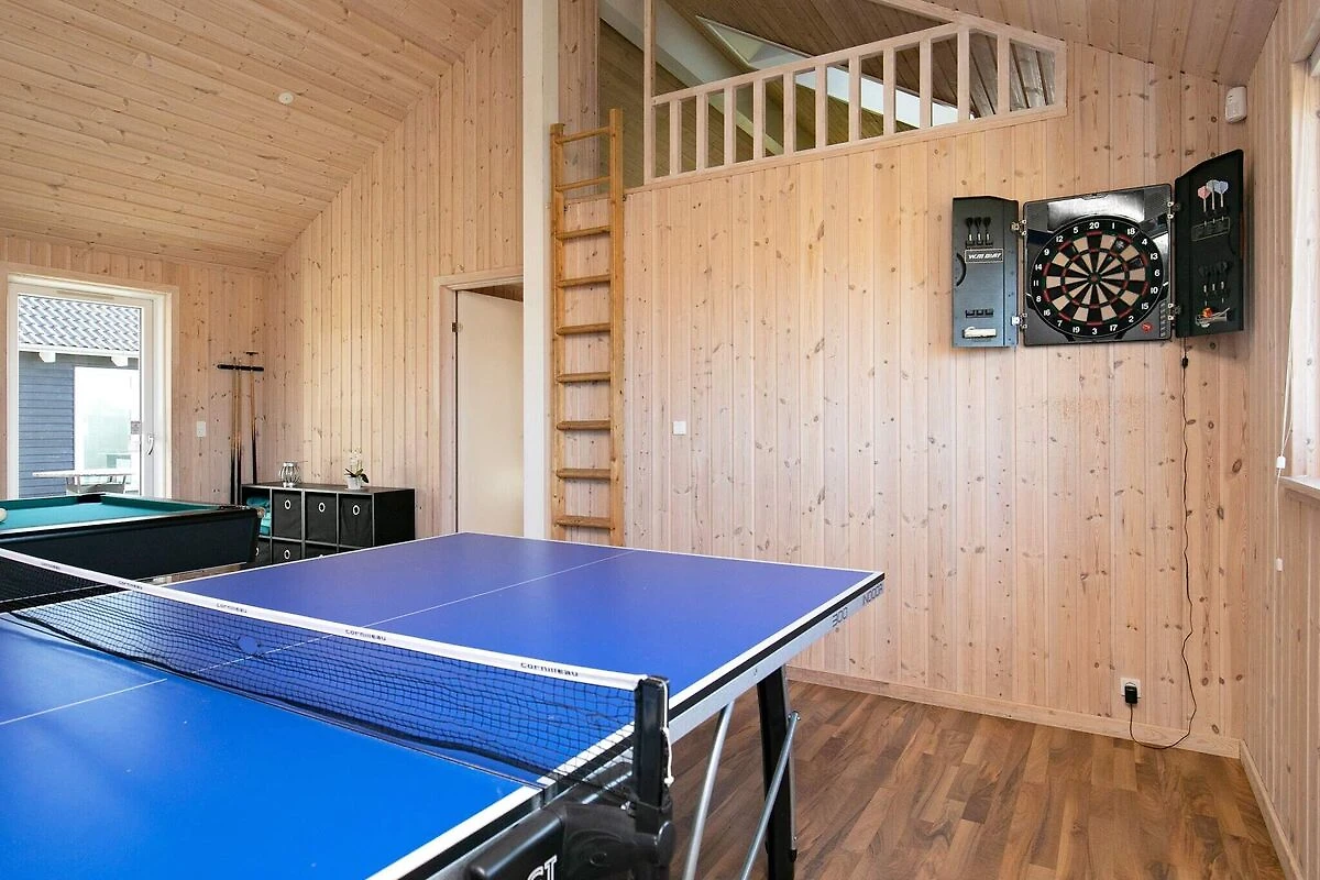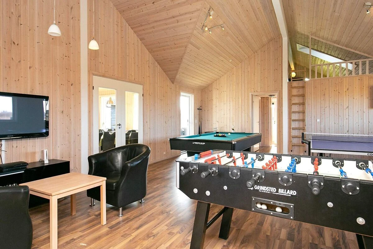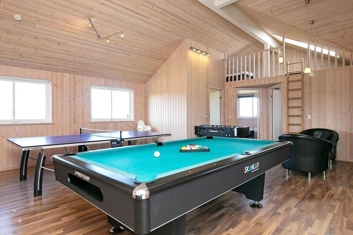 Offene Küche(Kochherd(elektrisch), Dunstabzugshaube, Kaffeemaschine, Mikrowelle, Spülmaschine, Kühlschrank, Tiefkühlschrank(200-249L)), Wohn-/Schlafzimmer(TV(Kabel, Deutsch Fernsehsender, dänische Fernsehsender), Blu-ray-Player, CD-Spieler, Stereoanlage, Hochstuhl), Schlafzimmer(2x Einzelbett, Kinderbett), Schlafzimmer(2x Einzelbett), Schlafzimmer(2x Einzelbett), Schlafzimmer(2x Einzelbett), Schlafzimmer(2x Einzelbett), Schlafzimmer(2x Einzelbett), Schlafzimmer(2x Einzelbett), Schlafzimmer(2x Einzelbett), Badezimmer(Fußbodenheizung)(Trockner, Badewanne oder Dusche, Waschbecken, Toilette, Waschmaschine), Badezimmer(Fußbodenheizung)(Badewanne oder Dusche, Waschbecken, Toilette), Badezimmer(Fußbodenheizung)(Badewanne oder Dusche, Waschbecken, Toilette), Badezimmer(Fußbodenheizung)(Badewanne oder Dusche, Waschbecken, Toilette), Empore(4x Einzelklappbett ), Spielkonsole, Whirlwanne(im Innenbereich, erwärmt, 5 Personen), Sauna(im Innenbereich, erwärmt, 5 Personen), Heizung(elektrisch), Terrasse, Grill, Pool(im Innenbereich, 180 m2), Spielgeräte, Tischtennisplatte, Tischfußball, Dart, Billard, Erdwärme, Luft-Wasser-Wärmepumpe