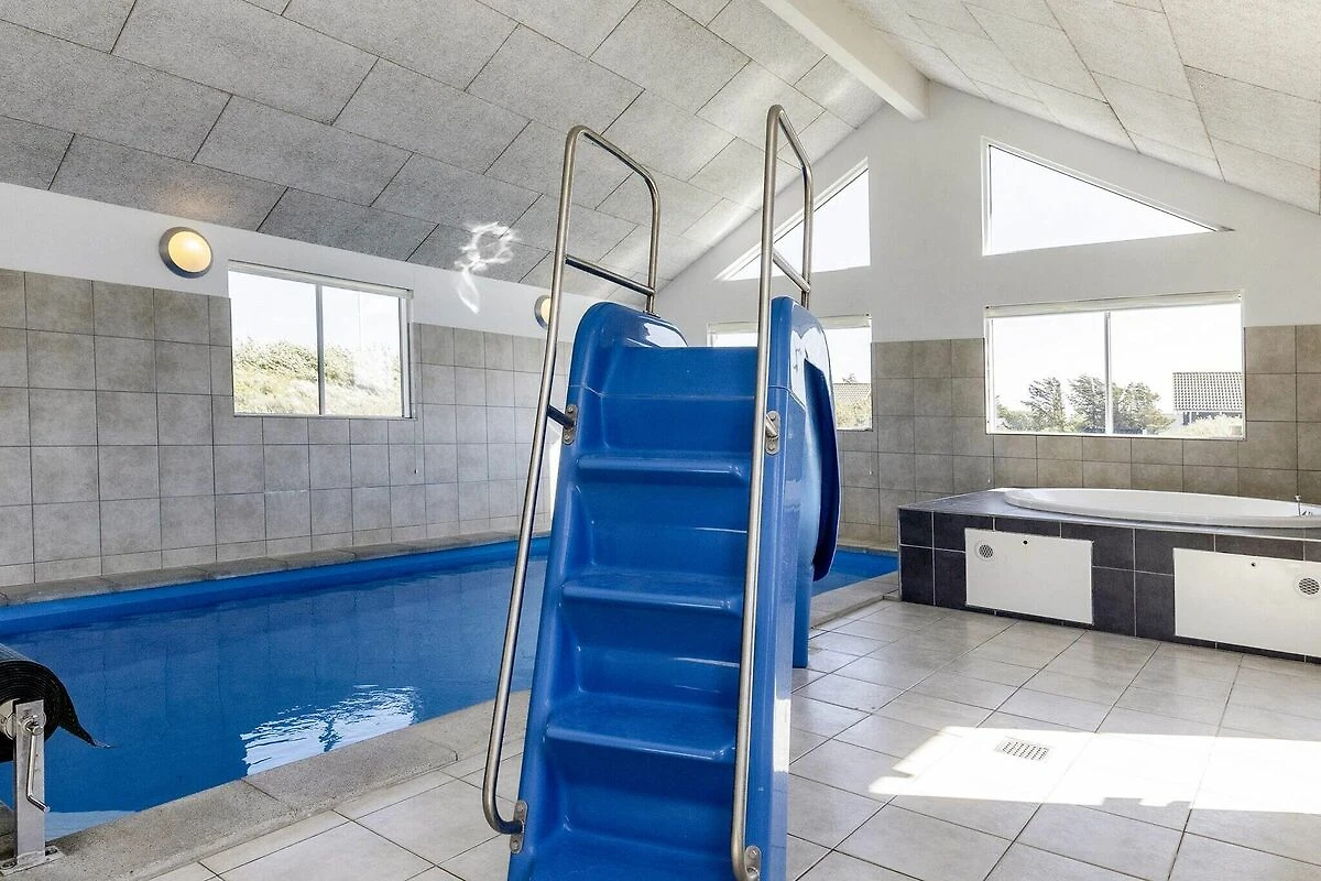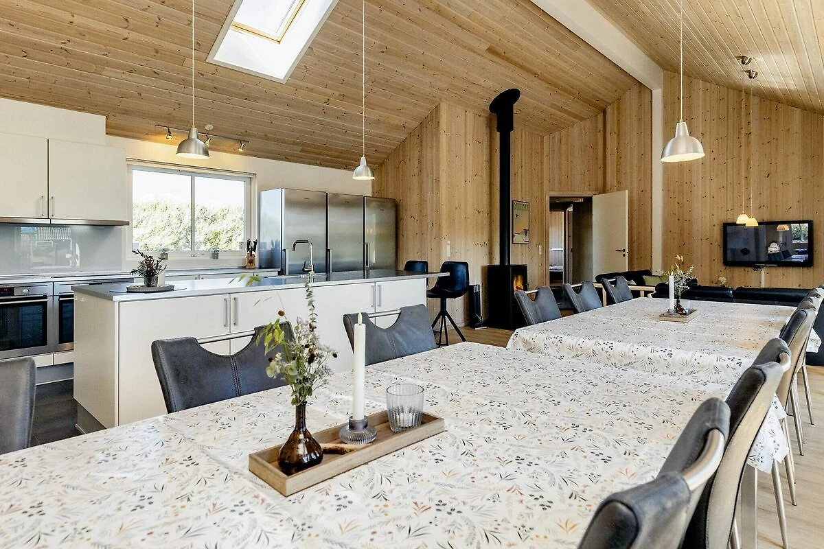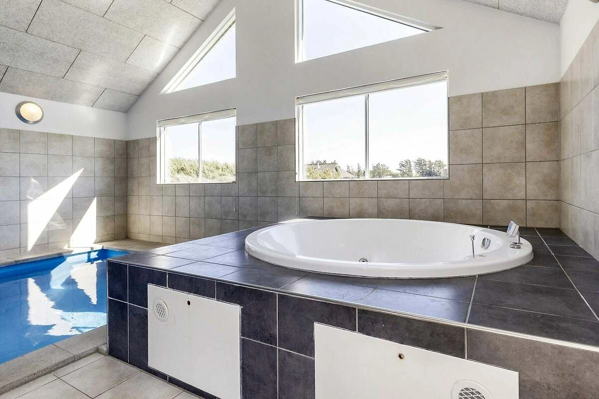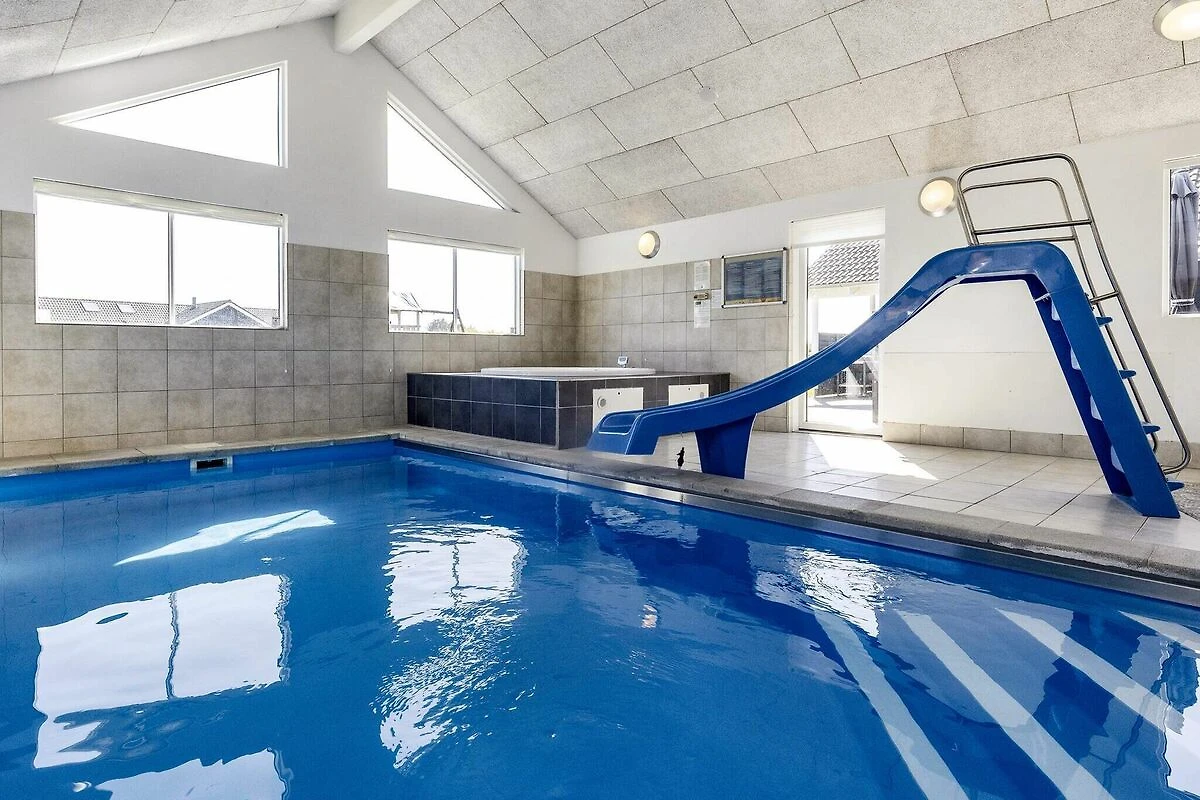 Offene Küche(Kochherd(elektrisch), Dunstabzugshaube, Kaffeemaschine, Mikrowelle, Spülmaschine, Kühlschrank, Tiefkühlschrank(200-249L)), Wohn-/Schlafzimmer(TV(Kabel, Deutsch Fernsehsender, dänische Fernsehsender), Blu-ray-Player, CD-Spieler, Stereoanlage, Hochstuhl), Schlafzimmer(2x Einzelbett, Kinderbett), Schlafzimmer(2x Einzelbett), Schlafzimmer(2x Einzelbett), Schlafzimmer(2x Einzelbett), Schlafzimmer(2x Einzelbett), Schlafzimmer(2x Einzelbett), Schlafzimmer(2x Einzelbett), Schlafzimmer(2x Einzelbett), Badezimmer(Fußbodenheizung)(Trockner, Badewanne oder Dusche, Waschbecken, Toilette, Waschmaschine), Badezimmer(Fußbodenheizung)(Badewanne oder Dusche, Waschbecken, Toilette), Badezimmer(Fußbodenheizung)(Badewanne oder Dusche, Waschbecken, Toilette), Badezimmer(Fußbodenheizung)(Badewanne oder Dusche, Waschbecken, Toilette), Empore(4x Einzelklappbett ), Spielkonsole, Whirlwanne(im Innenbereich, erwärmt, 5 Personen), Sauna(im Innenbereich, erwärmt, 5 Personen), Heizung(elektrisch), Terrasse, Grill, Pool(im Innenbereich, 180 m2), Spielgeräte, Tischtennisplatte, Tischfußball, Dart, Billard, Erdwärme, Luft-Wasser-Wärmepumpe