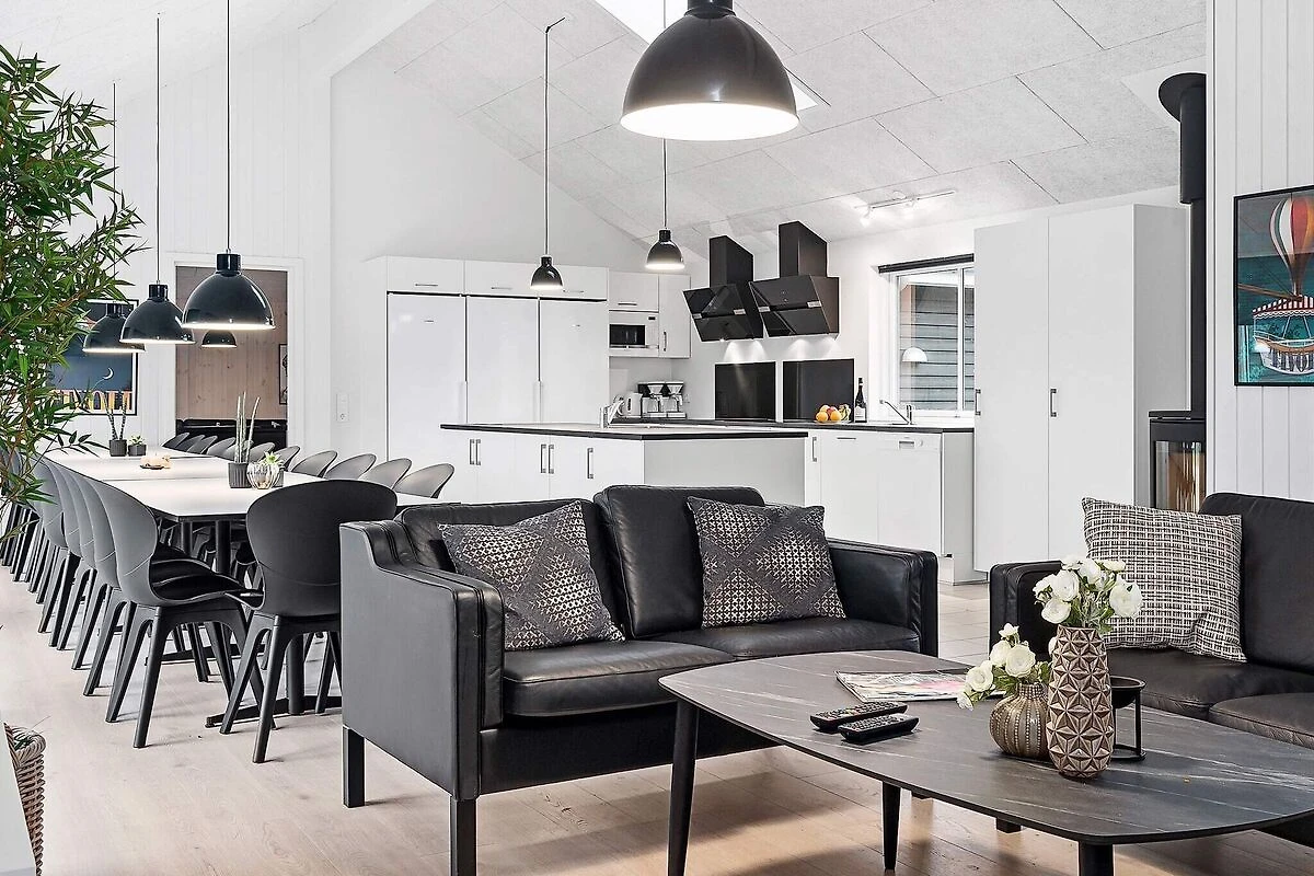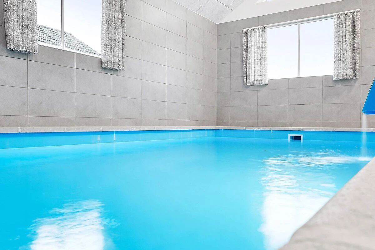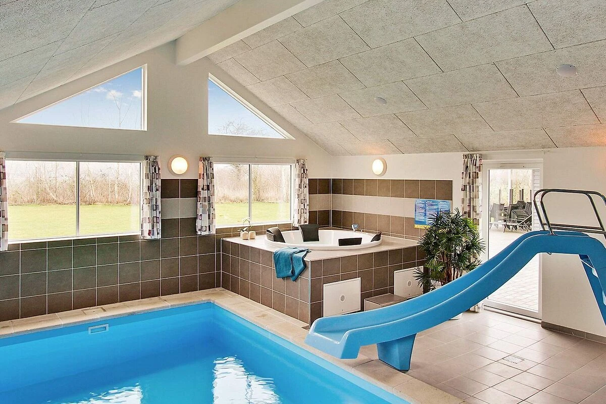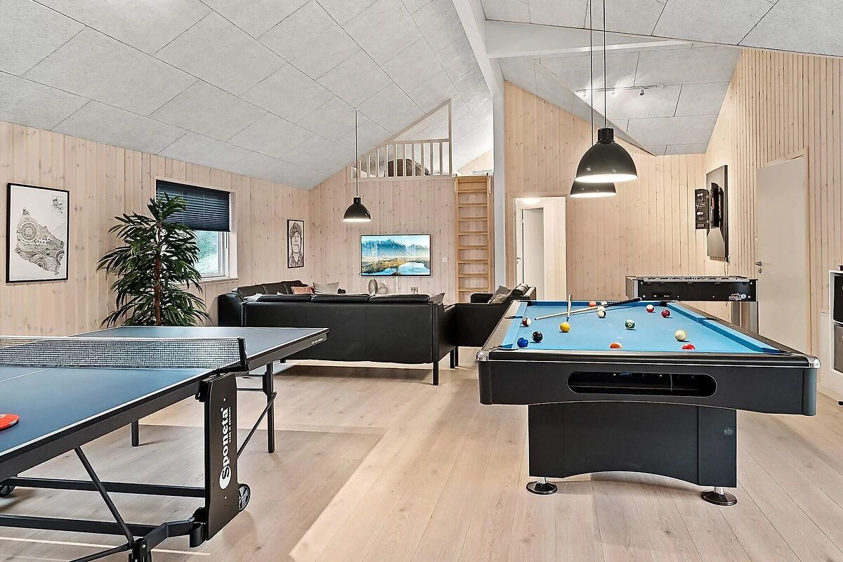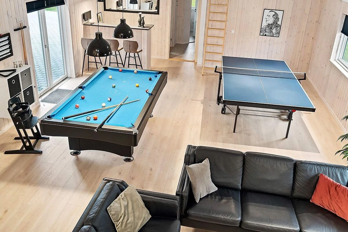 Aktivitäts- und Wohlfühlfaktor sind in diesem ansprechend eingerichteten Ferienhauses ganz groß geschrieben! Ein großer Poolbereich erwartet Sie mit einem Swimmingpool, der mit Gegenstromanlage, Unterwasserbeleuchtung und Wasserrutsche ausgestattet ist. Nach dem Schwimmen können Sie in der Sauna oder im Whirlpool, der 4-6 Personen Platz bietet, entspannen. So erholt kann es im Aktivitätsraum weitergehen, wo Sie sich bei einer Partie Pool am Billardtisch, beim Tischtennis, am Kicker oder einem Spiel an der PlayStation4 herausfordern können. Wer es lieber ruhig mag, setzt sich einfach an die Bar und genießt einen Urlaubsdrink. Das Haus hat eine gute Raumaufteilung, u.a. mit drei separaten Schlafbereichen mit je einem zugehörigen Badezimmer. Ein weiteres Bad ist im Poolbereich untergebracht. Im geschmackvoll eingerichteten Wohnzimmer gibt es einen gemütlichen Sitzbereich und einen langen Esstisch, an dem alle gemütlich beisammen sitzen können. Stereoanlage und Flachbild-TV sorgen hier für Unterhaltung und der Holzofen für gemütliche Wärme. Der offene Küchenbereich verfügt u.a. über je zwei Cerankochfelder, Öfen, Kühlschränke, Kaffeemaschinen und Spülmaschinen. Insgesamt stehen neun Schlafzimmer und zwei geräumige Schlafgalerien zur Verfügung, alle mit Boxspringmatratzen ausgestattet. Die Einzelbetten können zu Doppelbetten zusammengeschoben werden. Draußen können Sie sich auf der teilweise überdachten Terrassenfläche sonnen oder abends ein köstliches Dinner auf dem Grill brutzeln. Mit der modernen Einrichtung und der umfangreichen Ausstattung, ist dieses Skanlux-Haus perfekt für Familienferien mit mehreren Generationen oder den Aufenthalt einer Firma, die ein Meeting außerhalb der Büroräume halten möchte. Das Haus wird über eine Wärmepumpe energiesparend erwärmt. Bitte beachten Sie, dass für den Betrieb des Swimmingpools sowie bei Nutzung der Gegenstromanlage, der Sauna und des Whirlpools mit einem erhöhten Verbrauch von Nebenkosten gerechnet werden muss und deshalb fallen je nach Intensität, Nutzung und Jahreszeit erhöhte Extrakosten an. Modellbilder! ***Auf naheliegenden / direkt an das Haus angrenzenden Flächen werden weiterhin neue Häuser errichtet, so dass wir Sie darauf hinweisen möchten, dass es zu Beeinträchtigungen durch Bauarbeiten kommen kann.*** *** Wichtige Info: Anstelle der Barzahlung vor Ort, zahlen Sie bitte die Kaution und Wäschepakete etc. unter Angabe der Buchungsnummer an unseren Servicepartner auf folgende Bankverbindung ein:IBAN: DE58 2175 0000 0165 3631 28, BIC: NOLADE21NOS.*** Keine Vermietung an Jugendgruppen.
