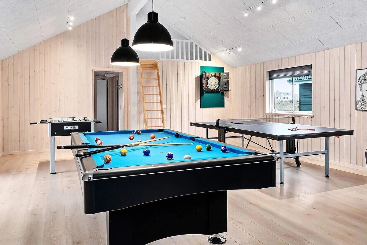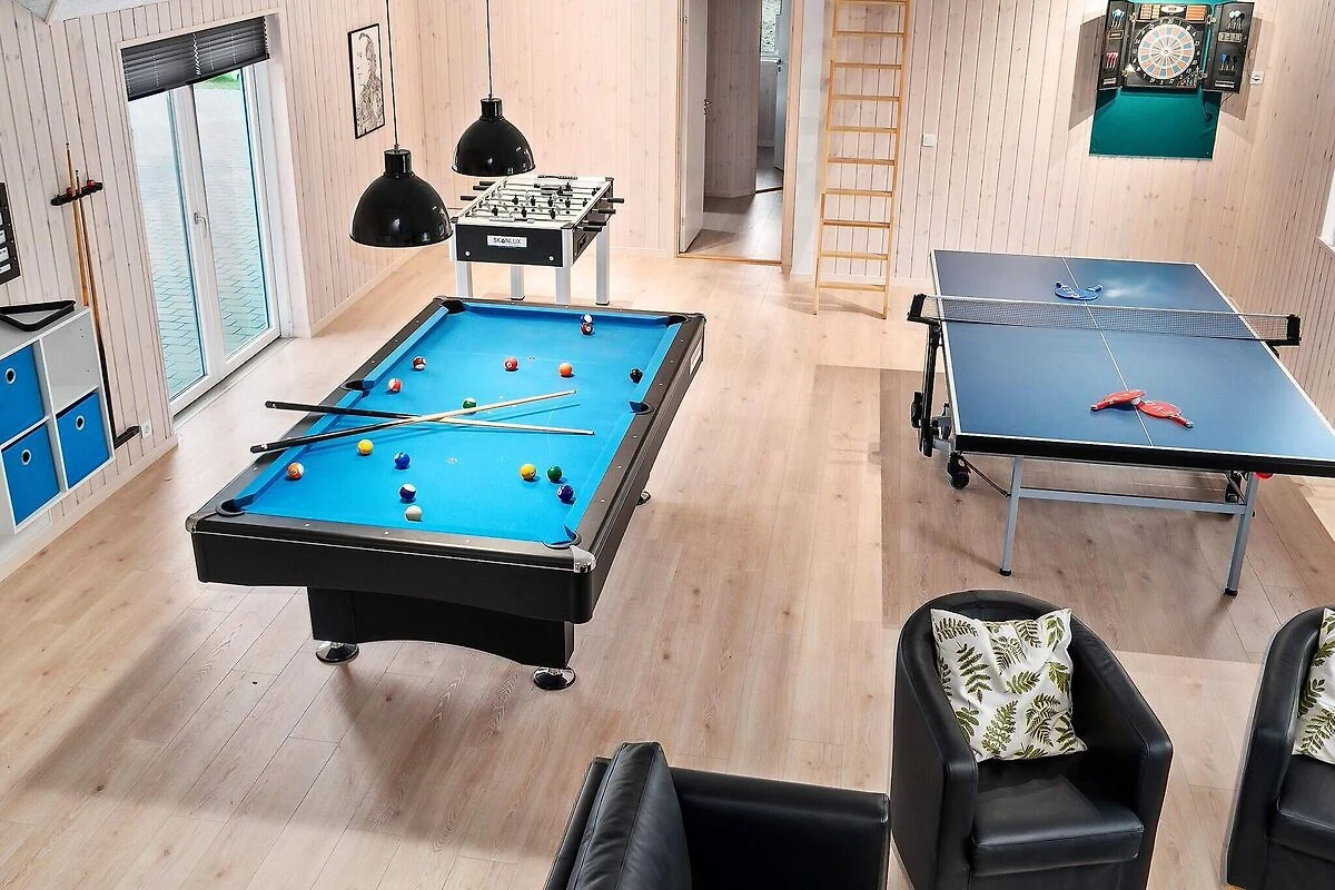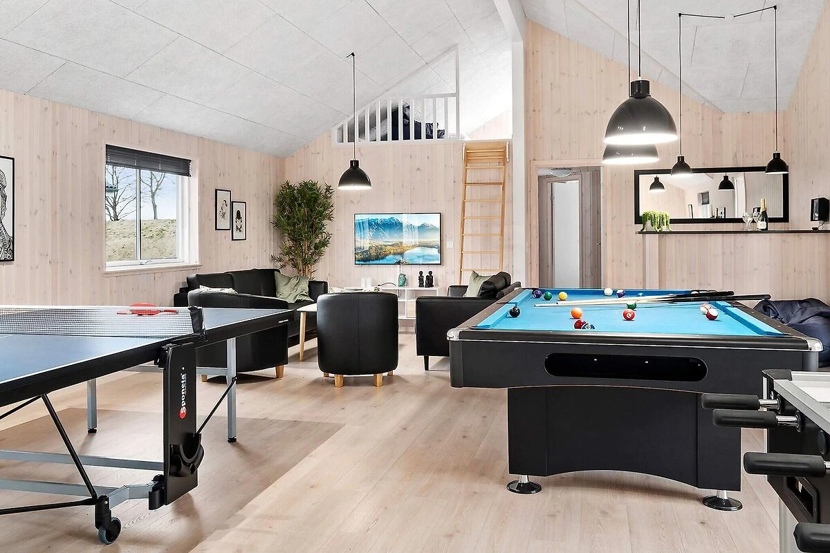 Aktivitäts- und Wohlfühlfaktor sind in diesem ansprechend eingerichteten Ferienhauses ganz groß geschrieben! Ein großer Poolbereich erwartet Sie mit einem Swimmingpool, der mit Gegenstromanlage, Unterwasserbeleuchtung und Wasserrutsche ausgestattet ist. Nach dem Schwimmen können Sie in der Sauna oder im Whirlpool, der 4-6 Personen Platz bietet, entspannen. So erholt kann es im Aktivitätsraum weitergehen, wo Sie sich bei einer Partie Pool am Billardtisch, beim Tischtennis, am Kicker oder einem Spiel an der PlayStation4 herausfordern können. Wer es lieber ruhig mag, setzt sich einfach an die Bar und genießt einen Urlaubsdrink. Das Haus hat eine gute Raumaufteilung, u.a. mit drei separaten Schlafbereichen mit je einem zugehörigen Badezimmer. Ein weiteres Bad ist im Poolbereich untergebracht. Im geschmackvoll eingerichteten Wohnzimmer gibt es einen gemütlichen Sitzbereich und einen langen Esstisch, an dem alle gemütlich beisammen sitzen können. Stereoanlage und Flachbild-TV sorgen hier für Unterhaltung und der Holzofen für gemütliche Wärme. Der offene Küchenbereich verfügt u.a. über je zwei Cerankochfelder, Öfen, Kühlschränke, Kaffeemaschinen und Spülmaschinen. Insgesamt stehen neun Schlafzimmer und zwei geräumige Schlafgalerien zur Verfügung, alle mit Boxspringmatratzen ausgestattet. Die Einzelbetten können zu Doppelbetten zusammengeschoben werden. Draußen können Sie sich auf der teilweise überdachten Terrassenfläche sonnen oder abends ein köstliches Dinner auf dem Grill brutzeln. Mit der modernen Einrichtung und der umfangreichen Ausstattung, ist dieses Skanlux-Haus perfekt für Familienferien mit mehreren Generationen oder den Aufenthalt einer Firma, die ein Meeting außerhalb der Büroräume halten möchte. Das Haus wird über eine Wärmepumpe energiesparend erwärmt. Bitte beachten Sie, dass für den Betrieb des Swimmingpools sowie bei Nutzung der Gegenstromanlage, der Sauna und des Whirlpools mit einem erhöhten Verbrauch von Nebenkosten gerechnet werden muss und deshalb fallen je nach Intensität, Nutzung und Jahreszeit erhöhte Extrakosten an. Modellbilder! ***Auf naheliegenden / direkt an das Haus angrenzenden Flächen werden weiterhin neue Häuser errichtet, so dass wir Sie darauf hinweisen möchten, dass es zu Beeinträchtigungen durch Bauarbeiten kommen kann.*** *** Wichtige Info: Anstelle der Barzahlung vor Ort, zahlen Sie bitte die Kaution und Wäschepakete etc. unter Angabe der Buchungsnummer an unseren Servicepartner auf folgende Bankverbindung ein:IBAN: DE58 2175 0000 0165 3631 28, BIC: NOLADE21NOS.*** Keine Vermietung an Jugendgruppen.