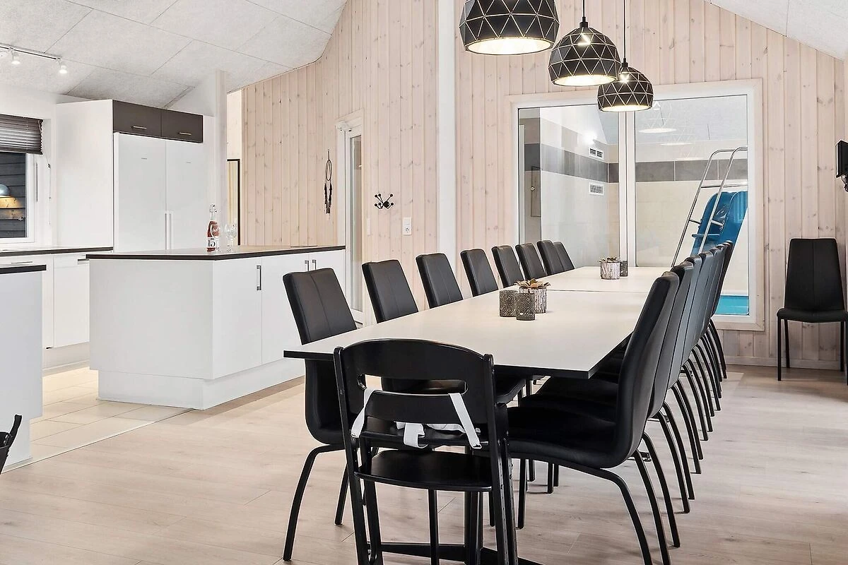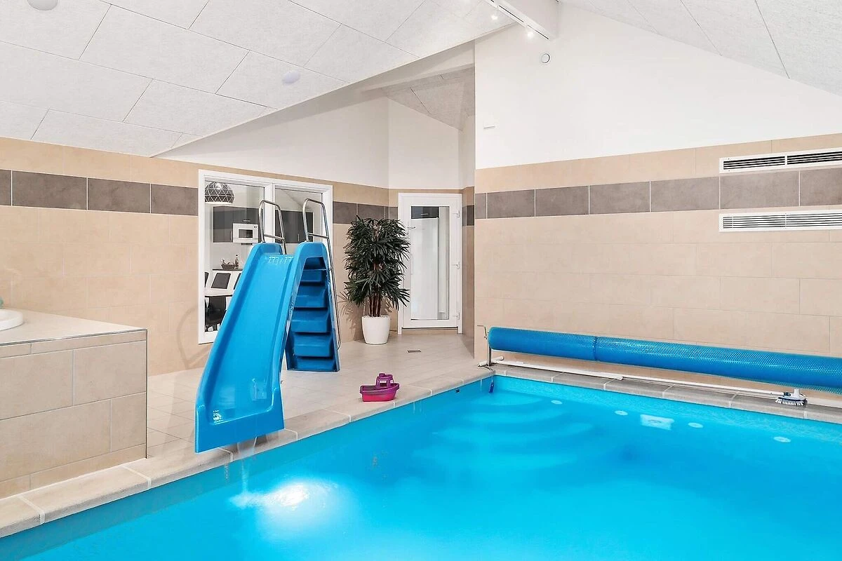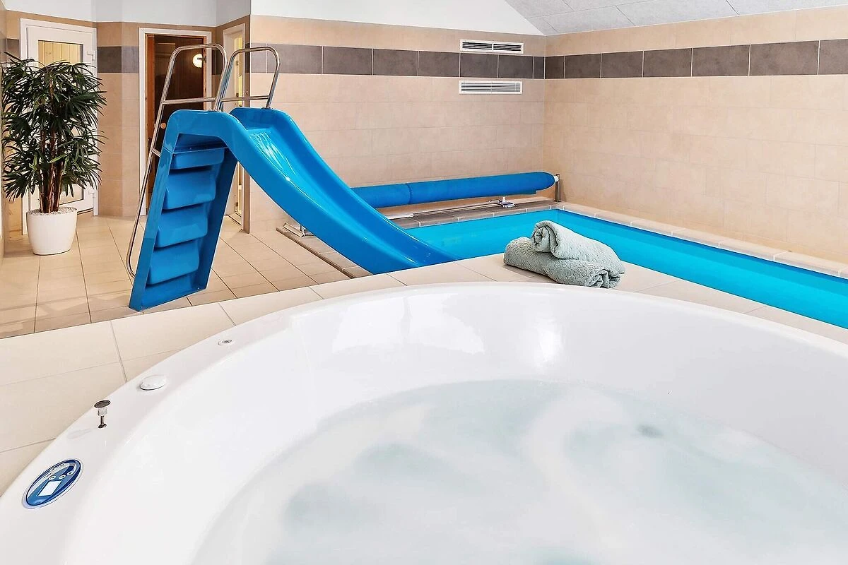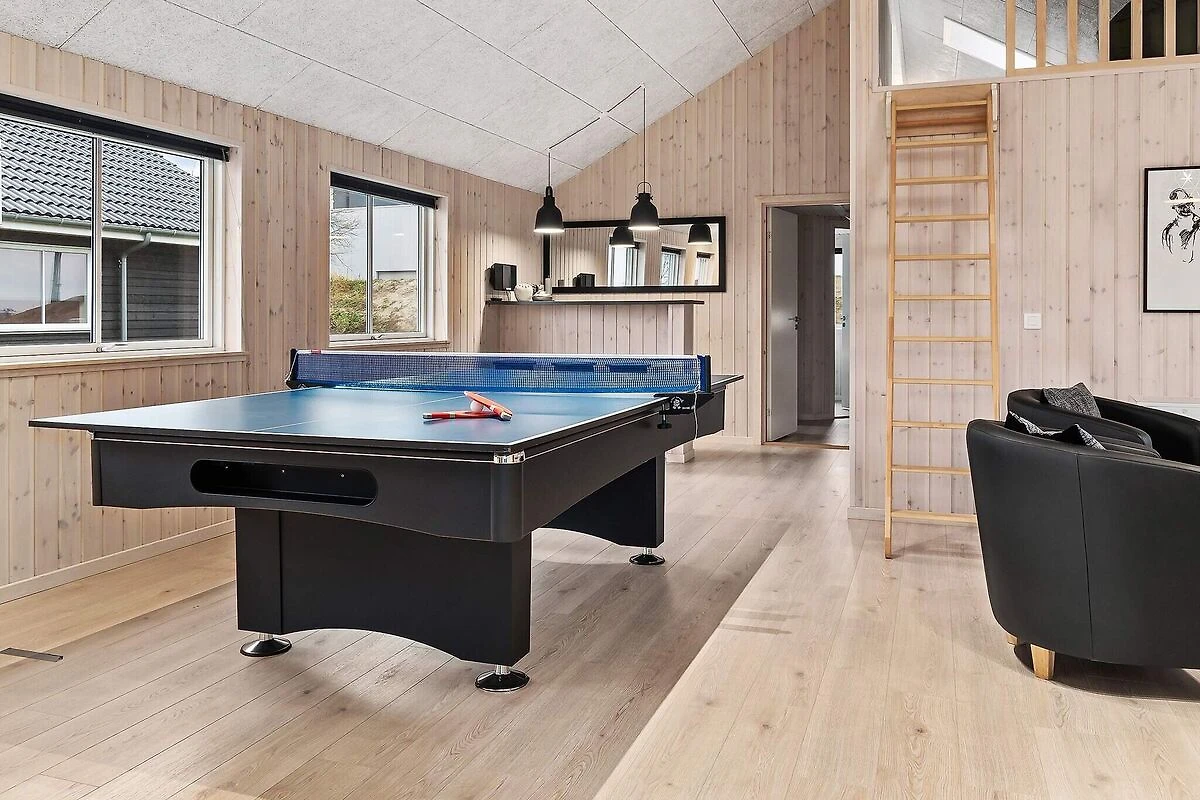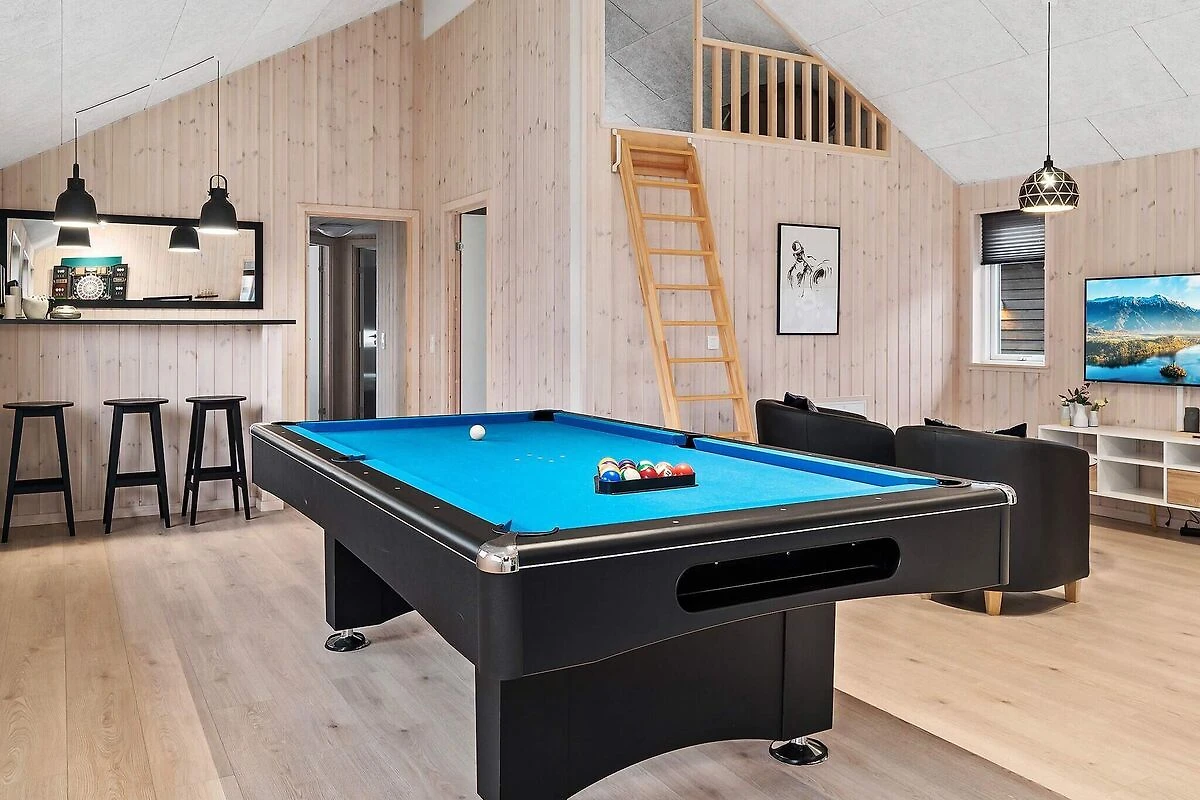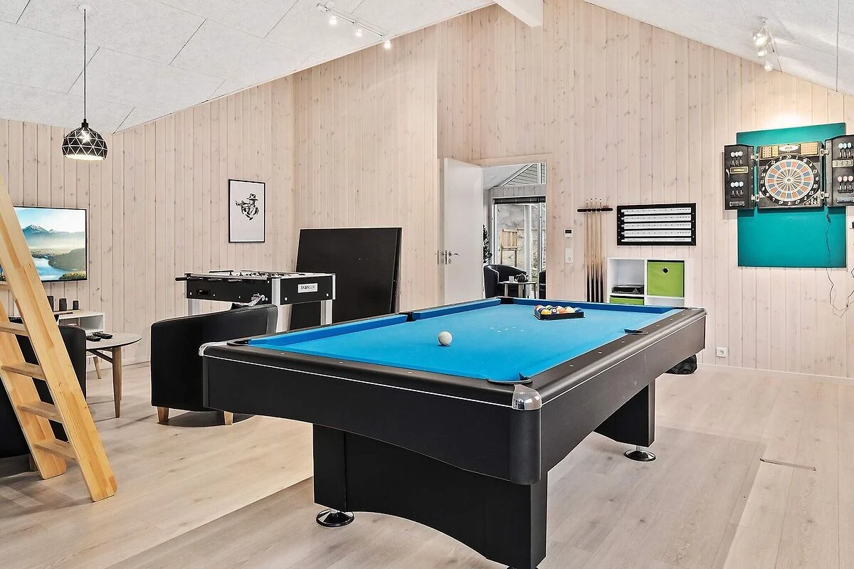 Ob im Pool baden oder Poolbillard spielen – hier ist beides möglich. Das ansprechende Aktivitäts-Ferienhaus liegt nur etwa 900 m vom Sandstrand entfernt und bietet seinen Gästen neben einer modernen Einrichtung auch eine umfangreiche Ausstattung, die perfekt für Familienferien mit mehreren Generationen ist. Poolbereich und Aktivitätsraum werden sicherlich das ganze Jahr über zu den besonders frequentierten Räumen im Haus gehören. Im Poolraum erwartet Sie ein Swimmingpool mit Gegenstromanlage und Wassserrutsche, ein eingebauter Whirlpool für 4-6 Personen sowie eine Sauna und ein Bad. Der Aktivitätsraum ist mit Billardtisch, Kicker, Tischtennis, PS4 und Dartscheibe ausgestattet – für viele vergnügliche Stunden ist also gesorgt. In den Spielpausen kann man dann an der gemütlichen kleinen Bar oder in der Sitzecke entspannen. Im Wohn-Essbereich stehen Stereoanlage, Fernseher, DVD-Spieler, Kaminofen, Sitzgruppe und ein großer Esstisch zur Verfügung. Für Kinder ist ein Hochstuhl vorhanden. Der Essplatz liegt praktischerweise vor dem Küchenbereich, in dem es u.a. je zwei Herde, Kaffeemaschinen und Spülmaschinen gibt. Vier der Schlafzimmer liegen hinter dem Aktivitätsraum, und drei direkt hinter dem Eingangsbereich. Die Einzelbetten können zu Doppelbetten zusammengeschoben werden. Es sind drei Badezimmer vorhanden und das Skanlux-Haus ist durchweg mit Fußbodenheizung ausgestattet. Für ein angenehmes Innenklima sorgt die energiesparende Wärmepumpe. Ein großer Teil der Terrassenfläche ist überdacht. Machen Sie es sich hier in den Gartenmöbeln bequem oder brutzeln Sie ein schönes Abendessen auf dem Grill. Bitte beachten Sie, dass für den Betrieb des Swimmingpools sowie bei Nutzung der Gegenstromanlage, der Sauna und des Whirlpools mit einem erhöhten Verbrauch von Nebenkosten gerechnet werden muss und deshalb fallen je nach Intensität, Nutzung und Jahreszeit erhöhte Extrakosten an. Modellbilder! ***Im Gebiet werden weiterhin neue Häuser errichtet, so dass wir Sie darauf hinweisen möchten, dass es zu Beeinträchtigungen kommen kann.*** *** Wichtige Info: Anstelle der Barzahlung vor Ort, zahlen Sie bitte die Kaution unter Angabe der Buchungsnummer an unseren Servicepartner auf folgende Bankverbindung ein:IBAN: DE58 2175 0000 0165 3631 28, BIC: NOLADE21NOS.*** Keine Vermietung an Jugendgruppen.