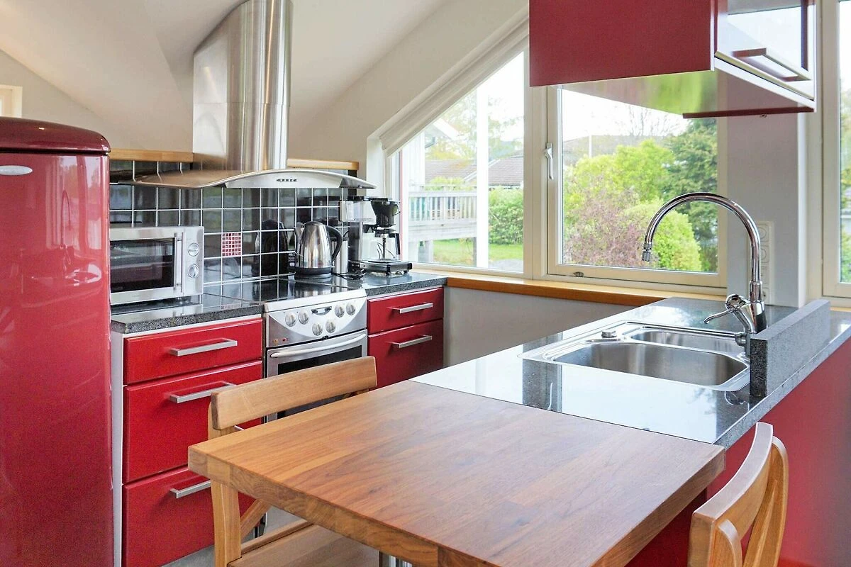 , Aufenthaltsraum(Einzelklappbett , Doppelbett), offene Küche(Kochherd(elektrisch), Dunstabzugshaube, Kaffeemaschine, Mikrowelle, Kühlschrank(+ Gefrierfach), Hochstuhl), Wohn-/Schlafzimmer(TV(schwedische Fernsehsender), Chromecast), Badezimmer(Trockner, Waschbecken, Dusche, Toilette, Waschmaschine), Balkon(Gartenmöbel, Grill), Parkplatz