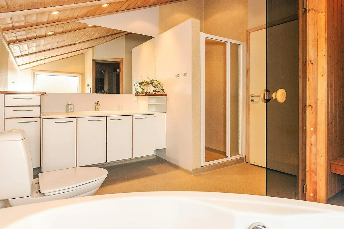 , Wohnzimmer(2x Einzelklappbett ), offene Küche(Kochherd(elektrisch), Dunstabzugshaube, Kaffeemaschine, Mikrowelle, Spülmaschine, Kühl-/Gefrierkombination, Trockner, Waschmaschine), Wohn-/Schlafzimmer(TV(Satellit, Deutsch Fernsehsender, dänische Fernsehsender), DVD-Spieler, CD-Spieler, Stereoanlage), Schlafzimmer(Doppelbett), Schlafzimmer(Doppelbett), Schlafzimmer(Doppelbett), Badezimmer(Fußbodenheizung)(Waschbecken, Toilette), Badezimmer(Fußbodenheizung)(Badewanne oder Dusche, Waschbecken, Toilette), Trockner, Whirlwanne(im Innenbereich, erwärmt, 2 Personen), Sauna(im Innenbereich, erwärmt, 3 Personen), Waschmaschine, Heizung(elektrisch), Terrasse, Terrasse(überdacht), Gartenmöbel, Spielgeräte, Luft-Luft-Wärmepumpe