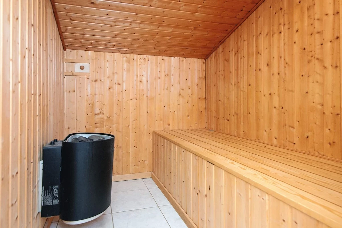 , offene Küche(Kochherd(elektrisch), Dunstabzugshaube, Kaffeemaschine, Spülmaschine, Kühl-/Gefrierkombination, Trockner, Waschmaschine), Wohn-/Schlafzimmer(TV(Satellit, Deutsch Fernsehsender, dänische Fernsehsender)), Schlafzimmer(Doppelbett), Schlafzimmer(Doppelbett), Schlafzimmer(2x Einzelbett), Badezimmer(Fußbodenheizung)(Waschbecken, Toilette), Badezimmer(Fußbodenheizung)(Badewanne oder Dusche, Waschbecken, Sonnenbank / Solarium, Toilette), Whirlwanne(im Innenbereich, erwärmt), Sauna(im Innenbereich, erwärmt), Heizung(elektrisch), Terrasse, Terrasse(überdacht), Luft-Luft-Wärmepumpe