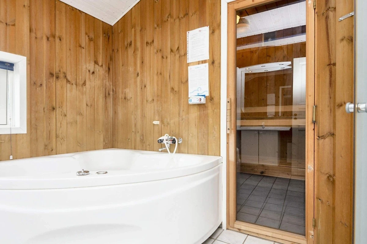 Offene Küche(Kochherd(elektrisch), Dunstabzugshaube, Kaffeemaschine, Mikrowelle, Spülmaschine, Kühl-/Gefrierkombination, Trockner, Waschmaschine), Wohn-/Schlafzimmer(TV(Deutsch Fernsehsender, dänische Fernsehsender), DVD-Spieler, Radio, Hochstuhl), Schlafzimmer(Doppelbett, Kinderbett), Schlafzimmer(Doppelbett), Schlafzimmer(Einzelbett, 2x Etagenbett), Schlafzimmer(Doppelklappbett ), Badezimmer(Badewanne oder Dusche, Waschbecken, Toilette), Badezimmer(Badewanne oder Dusche, Waschbecken, Toilette), Whirlwanne(im Innenbereich, erwärmt, 3 Personen), Sauna(im Innenbereich, erwärmt, 4 Personen), Heizung(elektrisch), Terrasse