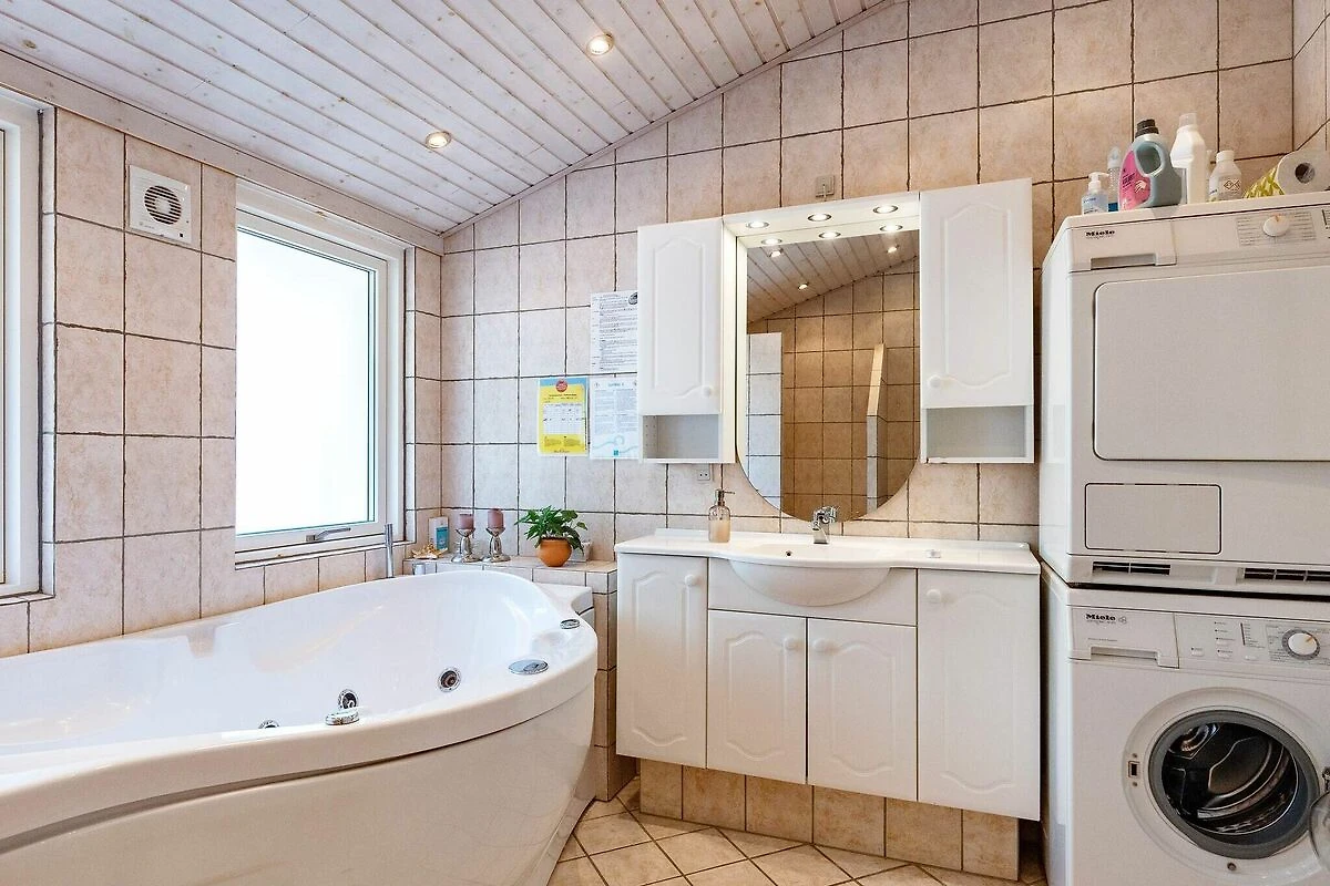 Offene Küche(Kochherd(elektrisch), Dunstabzugshaube, Kaffeemaschine, Mikrowelle, Spülmaschine, Kühl-/Gefrierkombination, Trockner, Waschmaschine), Wohn-/Schlafzimmer(TV, Hochstuhl), Schlafzimmer(Doppelbett, Kinderbett), Schlafzimmer(Doppelbett), Schlafzimmer(2x Etagenbett), Badezimmer(Badewanne oder Dusche, Waschbecken, Toilette), Whirlwanne(im Innenbereich, erwärmt, 2 Personen), Heizung(elektrisch), Terrasse, Grill, Luft-Wasser-Wärmepumpe