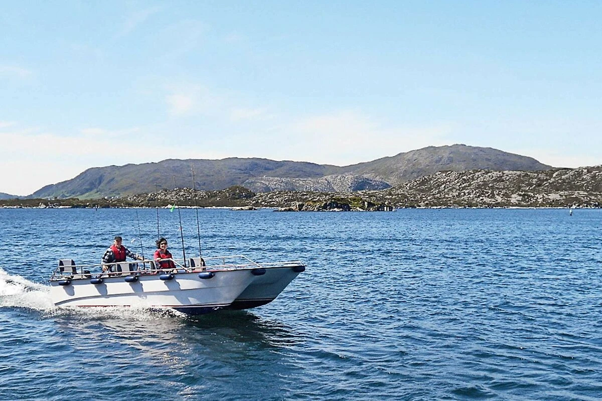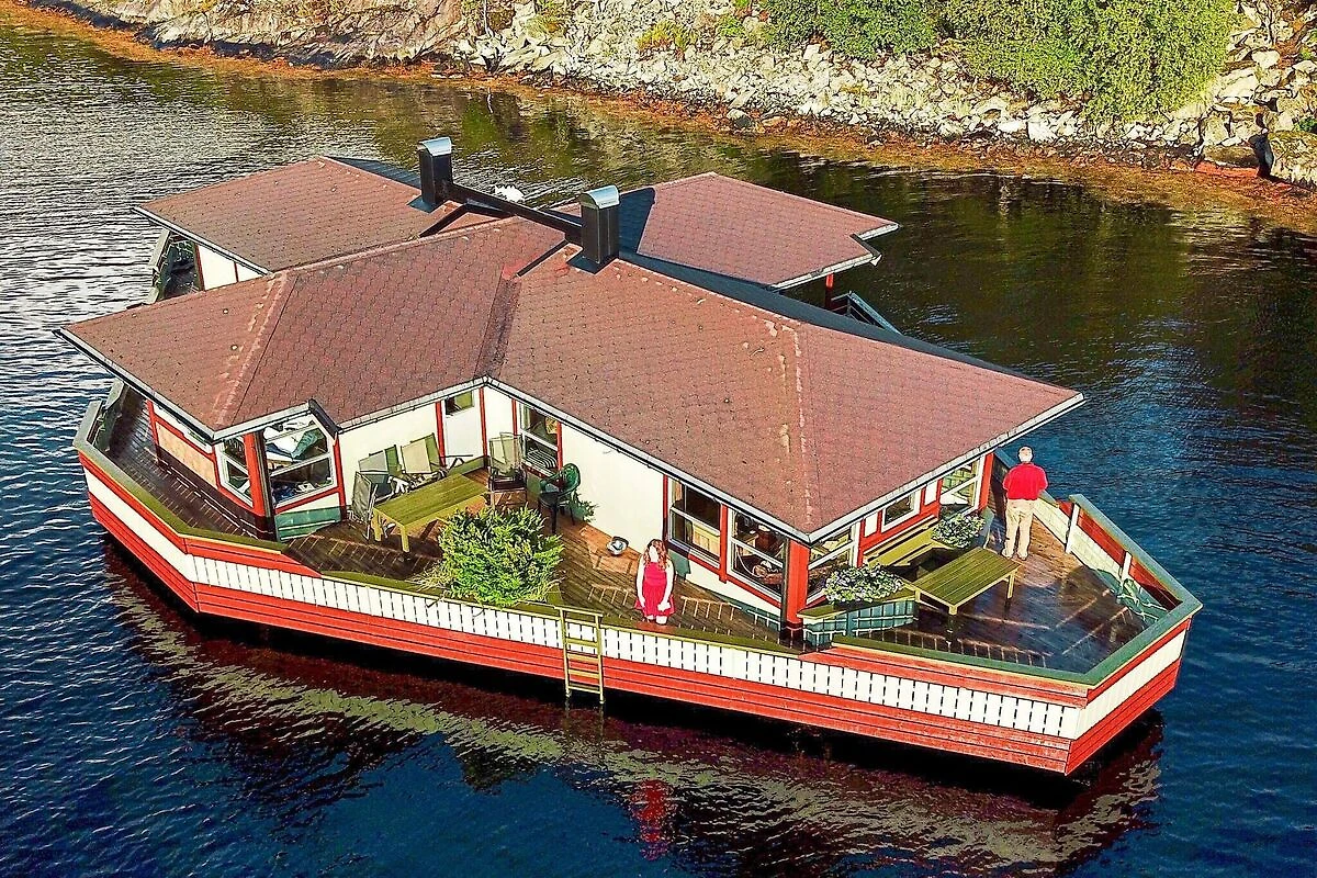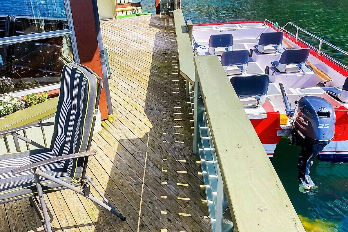 Eines von 2 einzigartigen Wasserhäusern, die in Norwegen vermietet werden. Erleben Sie hier, erstklassig untergebracht, Ferien direkt auf dem Wasser! Das Haus liegt fest verankert in einer lauen, großen Bucht, gut geschützt vor Wind und Wetter. Mit seinem Gewicht von 23 Tonnen liegt es ganz sicher und ruhig im nassen Element. Die dreieckige Konstruktion ist sehr stabil, sie befinden sich also sozusagen auf festem Grund, aber dennoch auf dem Wasser. Es bietet zwei Etagen und ist innen wie außen sehr geräumig. Nur wenige Ruderschläge entfernt, mit einem der beiden Boote die bereitliegen, hat man wieder festen Boden unter den Füßen. Dort am Ufer kann gegrillt, gebadet, gesonnt und gespielt werden. In der Nähe liegt auch das zweite Haus dieser Art mit der Hausnr. 38507. Dieses Haus bietet insgesamt 130 m² offene Verandafläche, verteilt auf 3 Hausecken, die durch überdachte Passagen miteinander verbunden sind. An der einen Hausseite liegt eine eigene Bootsgarage, die den Zugang direkt vom Boot und ins Haus trockenen Fußes ermöglicht. Wenn das Wetter mal nicht so toll ist, kann man sich hier im Trockenen beschäftigen. Das Haus ist umweltfreundlich und verursacht keine Eingriffe in die Natur. Man hat auch vom Bad aus direkten Zutritt zur umlaufenden Veranda. Zeitgemäße Küchenausstattung, darunter Gasherd mit Backofen. Die Wärmepumpe kann im Sommer auch als Klimaanlage genutzt werden. Geschmackvolle Einrichtung und herrlicher Ausblick durch die großen Fenster! Der Kaminofen sorgt an kühleren Tagen für wohlige Wärme. TV m. 20 norw./engl. Sendern zur Auswahl. Nachts erhellen Spotlights das Wasser unter dem Haus. Zugang zu einer Waschmaschine an Land. Bademöglichkeiten direkt vom Haus via Badeleiter oder nur 50 m weiter am seichten Ufer. Die Nutzung von zwei Fahrrädern, zwei Einer-Kajaks und einem Doppel-Kajak sowie einer Krabbenreuse ist inklusive. Außerdem stehen Ihnen zwei Boote zur Verfügung, das kleinere davon, ein 15 Fuß Ruderboot, damit man hinaus zum Haus auf dem Wasser gelangen kann. Das zweite Boot ist ein 17 Fuß Katamaran mit 20 PS Motor, sehr stabil und für bis zu 8 Personen ausgelegt. Schwimmwesten sind inklusive. Gutes Angelrevier das ganze Jahr über, ob in geschützten oder offenen Gewässern. Eigene Filetierbank für den Fang. Etwa 8 km nach Kalvåg, größtes und am besten erhaltenes, altes Fischerdorf der Region Vestlandet. Zum Grotlesanden, einem der schönsten Badestrände Norwegens, fährt man nur 14 km. Ein längerer Bootsausflug könnte nach Vingen führen, eines der größten Felder mit Felszeichnungen in ganz Nordeuropa. Die 1000 bis 1500 Figuren wurden vor 4000 bis 6000 Jahren geschaffen. Eine neue Straßenverbindung knüpft Bremangerlandet an Rugsundøy und das Festland und ermöglicht so schöne Ausflüge in die reizvolle Region Bremangerlandet. Aufgrund der Lage des Ferienhauses besteht der Vermieter auf die Nutzung von Schwimmwesten während des Aufenthalts! Es stellt Schwimmwesten für ein Körpergewicht von bis zu max. 100 kg bereit. Kann oder möchte man diese nicht nutzen, sind eigene, passende Schwimmwesten mitzubringen und anzulegen. Zugang zu Waschmaschine/Wäschetrockner an Land gegen Gebühr (NOK 50,-). Keine Vermietung an Jugend- oder Anglergruppen erwünscht!