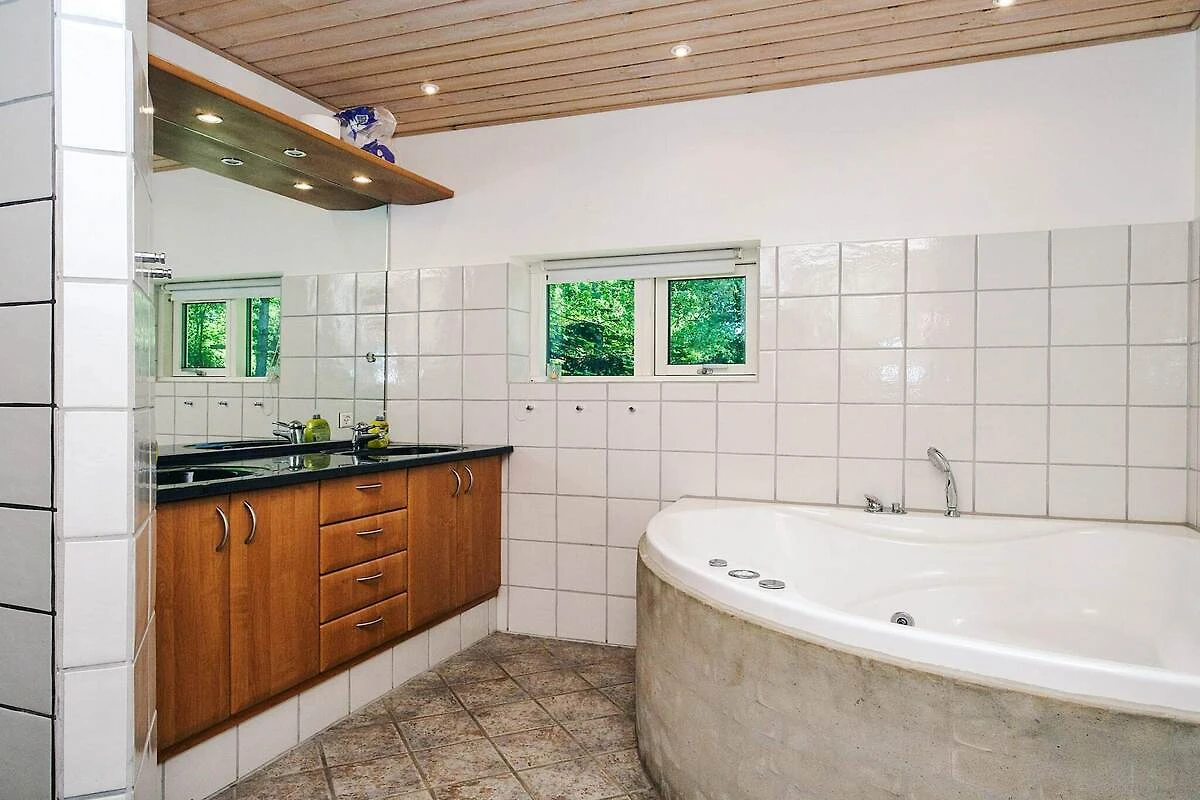 Offene Küche(Kochherd(elektrisch), Dunstabzugshaube, Kaffeemaschine, Mikrowelle, Spülmaschine, Kühl-/Gefrierkombination, Waschmaschine), Wohn-/Schlafzimmer(TV(Satellit, Deutsch Fernsehsender, dänische Fernsehsender), DVD-Spieler, CD-Spieler, Stereoanlage, Hochstuhl), Schlafzimmer(Doppelbett, Kinderbett), Schlafzimmer(Doppelbett), Schlafzimmer(2x Etagenbett), Badezimmer(Fußbodenheizung)(Badewanne oder Dusche, Waschbecken, Toilette), Badezimmer(Fußbodenheizung)(Waschbecken, Toilette), Empore(2x Einzelklappbett ), Whirlwanne(im Innenbereich), Sauna(im Innenbereich, erwärmt), Heizung(elektrisch), Terrasse, Grill, Spielgeräte