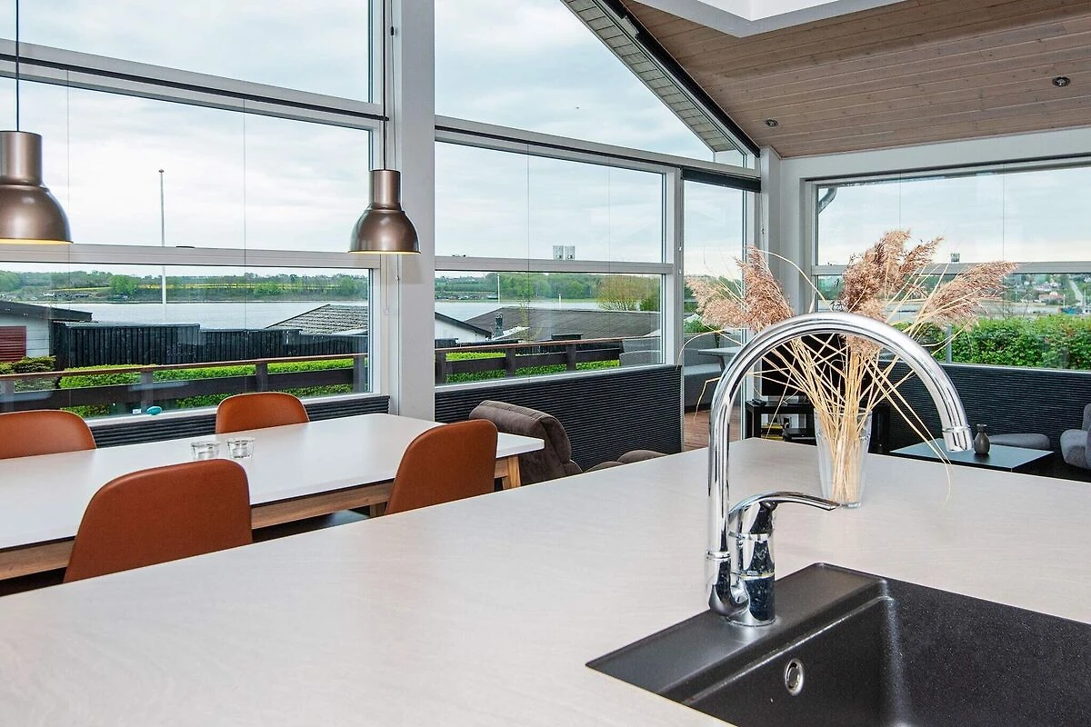 Der Wohn-Essbereich mit den bodentiefen Fenstern ist sehr schön, modern und gemütlich ausgestattet. Die umlaufende Terrasse mit den vielen Sitz-Möglichkeiten ist außergewöhnlich. Schöne Aussicht auf den Fjord.