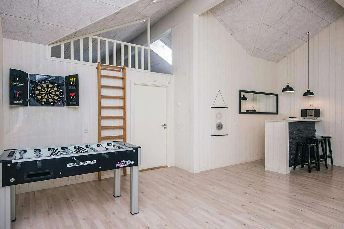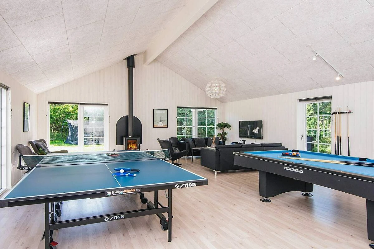 , Wohnzimmer(6x Einzelklappbett ), offene Küche(Kochherd(elektrisch), Dunstabzugshaube, Kaffeemaschine, Mikrowelle, Spülmaschine, Kühlschrank, Tiefkühlschrank(200-249L), Trockner, Waschmaschine), Wohn-/Schlafzimmer(TV(Kabel, Deutsch Fernsehsender, dänische Fernsehsender), Radio, CD-Spieler, Stereoanlage, Hochstuhl), Schlafzimmer(Doppelbett, Babybett), Schlafzimmer(Doppelbett), Schlafzimmer(Doppelbett), Schlafzimmer(2x Einzelbett), Schlafzimmer(2x Einzelbett), Schlafzimmer(2x Einzelbett), Schlafzimmer(2x Einzelbett), Schlafzimmer(2x Einzelbett), Schlafzimmer(2x Einzelbett), Badezimmer(Fußbodenheizung)(Badewanne oder Dusche, Waschbecken, Toilette), Badezimmer(Fußbodenheizung)(Badewanne oder Dusche, Waschbecken, Toilette), Badezimmer(Fußbodenheizung)(Badewanne oder Dusche, Waschbecken, Toilette), Badezimmer(Fußbodenheizung)(Badewanne oder Dusche, Waschbecken, Toilette), Spielkonsole, Whirlwanne(im Innenbereich, erwärmt, 6 Personen), Sauna(im Innenbereich, erwärmt, 6 Personen), Terrasse, Grill, Pool(im Innenbereich, 180 m2), Spielgeräte, Tischtennisplatte, Tischfußball, Dart, Billard, Erdwärme, Luft-Wasser-Wärmepumpe