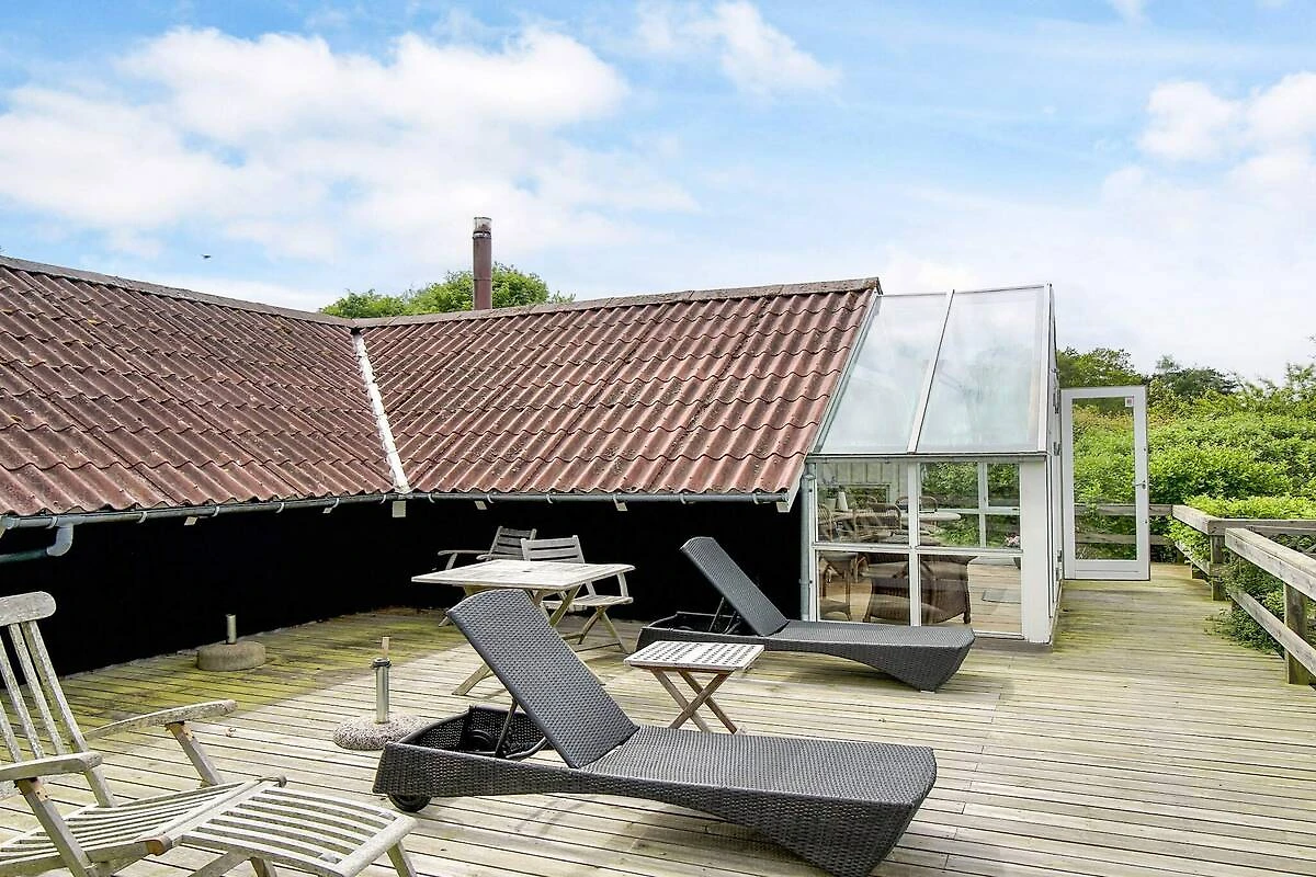 Offene Küche(Kochherd(elektrisch), Dunstabzugshaube, Kaffeemaschine, Mikrowelle, Spülmaschine, Kühl-/Gefrierkombination, Waschmaschine), Wohn-/Schlafzimmer(TV(Kabel, Deutsch Fernsehsender, dänische Fernsehsender)), Schlafzimmer(Doppelbett), Schlafzimmer(Doppelbett), Schlafzimmer(Einzelbett), Badezimmer(Badewanne oder Dusche, Waschbecken, Toilette), Wintergarten, Heizung(elektrisch), Terrasse, Grill