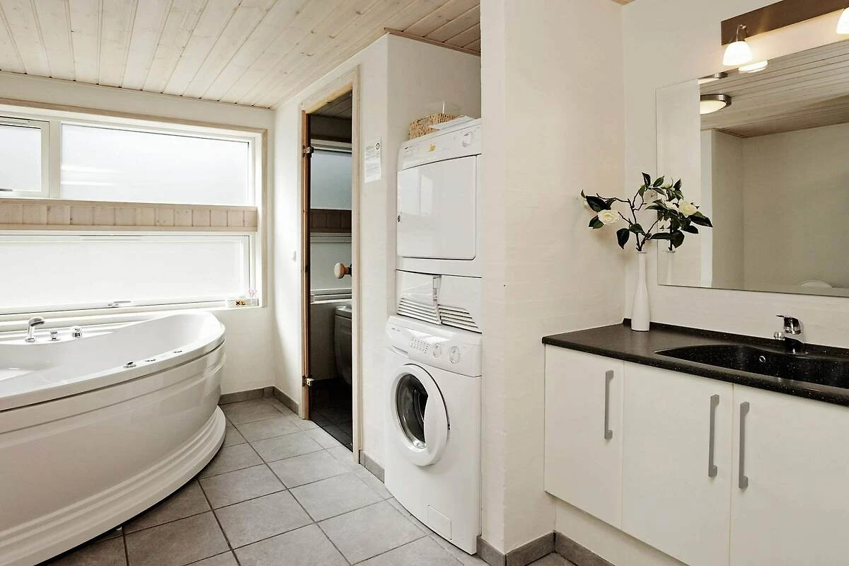 , Wohnzimmer(2x Einzelklappbett ), offene Küche(Kochherd(elektrisch), Dunstabzugshaube, Kaffeemaschine, Mikrowelle, Spülmaschine, Kühl-/Gefrierkombination, Trockner, Waschmaschine), Wohn-/Schlafzimmer(TV(Kabel, Deutsch Fernsehsender, dänische Fernsehsender), Radio, CD-Spieler, Stereoanlage, Hochstuhl), Schlafzimmer(Doppelbett, Babybett), Schlafzimmer(Doppelbett), Schlafzimmer(Doppelbett), Schlafzimmer(Doppelbett), Badezimmer(Fußbodenheizung)(Badewanne oder Dusche, Waschbecken, Toilette), Badezimmer(Fußbodenheizung)(Badewanne oder Dusche, Waschbecken, Toilette), Whirlwanne(im Innenbereich, 2 Personen), Sauna(im Innenbereich, erwärmt, 3 Personen), Heizung(elektrisch), Terrasse, Terrasse(überdacht), Grill
