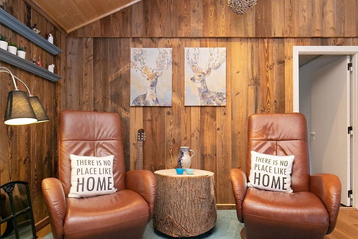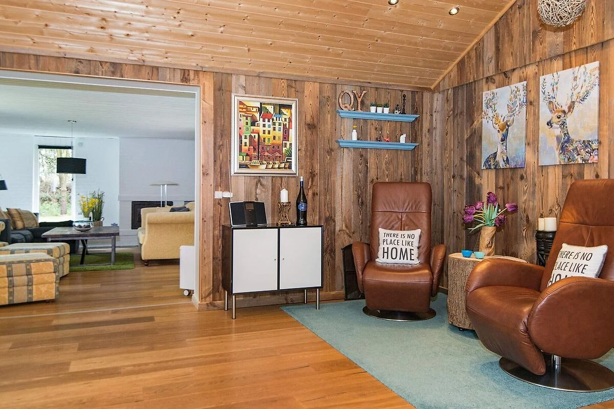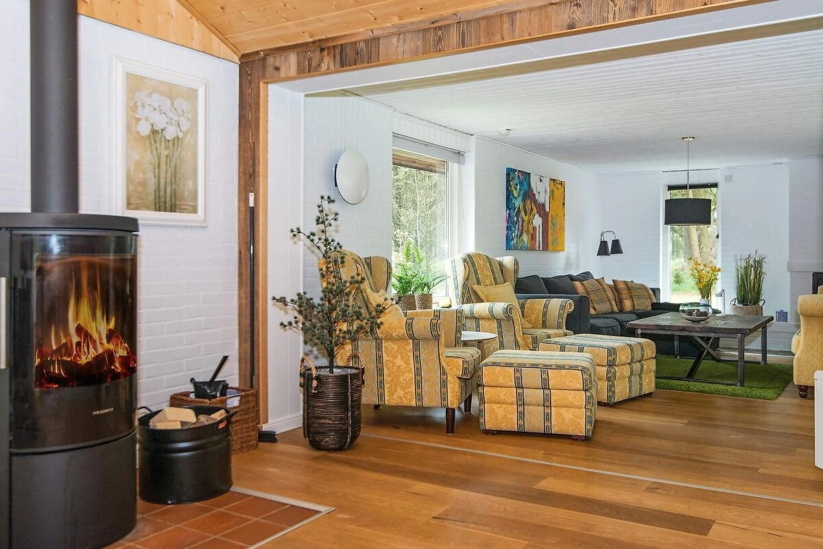, offene Küche(Kochherd(elektrisch), Dunstabzugshaube, Kaffeemaschine, Mikrowelle, Spülmaschine, Kühlschrank(+ Gefrierfach)), Wohn-/Schlafzimmer(TV(Satellit, Deutsch Fernsehsender), Kaminofen, DVD-Spieler, Radio), Schlafzimmer(Doppelbett), Schlafzimmer(Doppelbett), Schlafzimmer(2x Einzelbett), Badezimmer(Badewanne oder Dusche, Waschbecken, Toilette), Sauna(im Innenbereich, erwärmt, 5 Personen), Heizung(elektrisch), Terrasse, Luft-Luft-Wärmepumpe