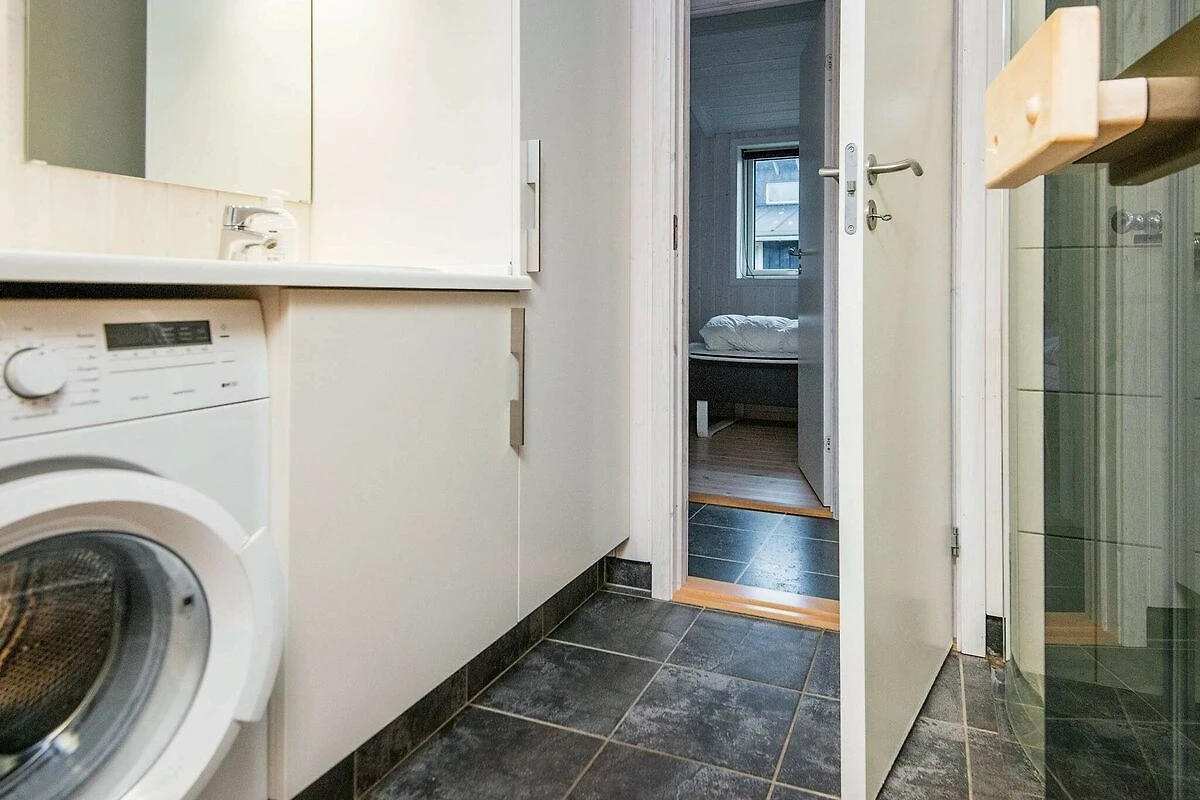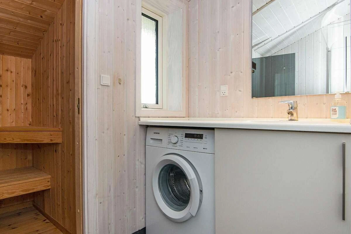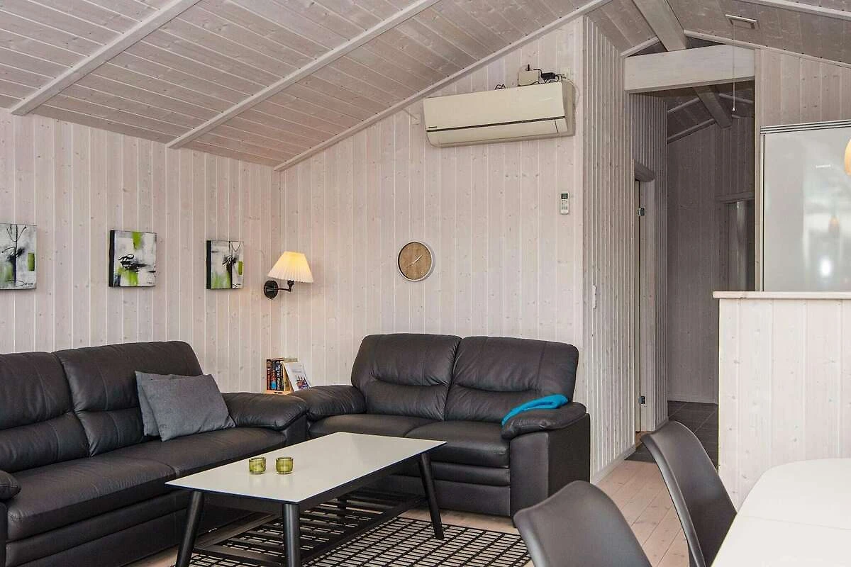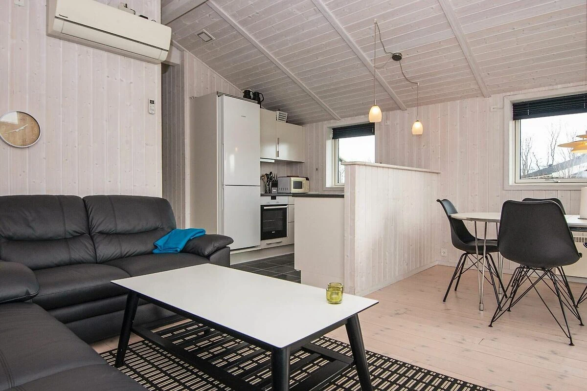 Offene Küche(Kochherd(elektrisch), Dunstabzugshaube, Kaffeemaschine, Mikrowelle, Spülmaschine, Kühl-/Gefrierkombination, Waschmaschine), Wohn-/Schlafzimmer(TV(Kabel, Deutsch Fernsehsender, dänische Fernsehsender), DVD-Spieler, Stereoanlage), Schlafzimmer(Doppelbett), Schlafzimmer(2x Einzelbett), Schlafzimmer(2x Einzelbett), Badezimmer(Fußbodenheizung)(Badewanne oder Dusche, Waschbecken, Toilette), Sauna(im Innenbereich, erwärmt, 3 Personen), Heizung(elektrisch), Terrasse, Spielgeräte, Luft-Luft-Wärmepumpe